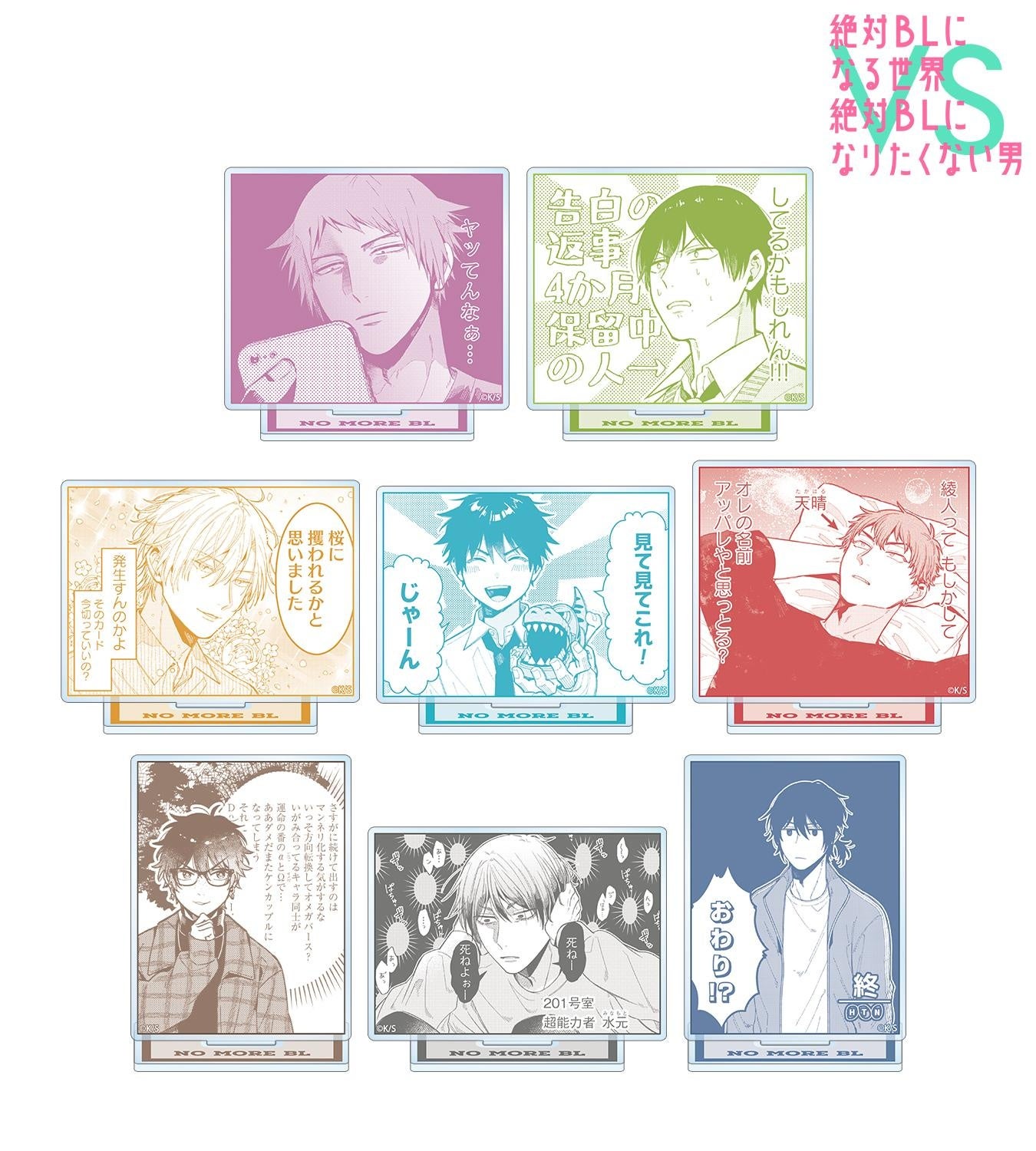 主人公、綾人、東條、柳、三郷、真山、水元、旗野の原作コマをアクリルスタンドに仕上げました。