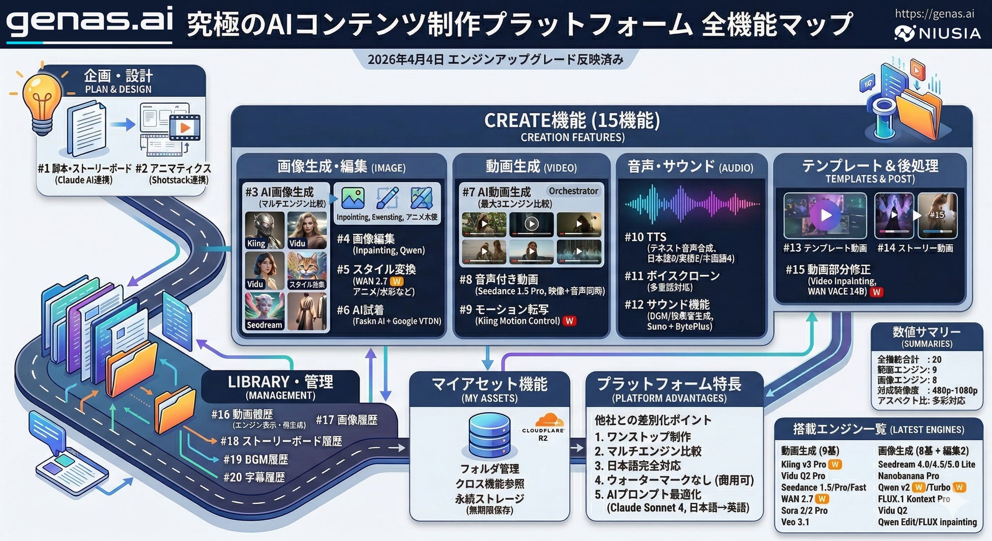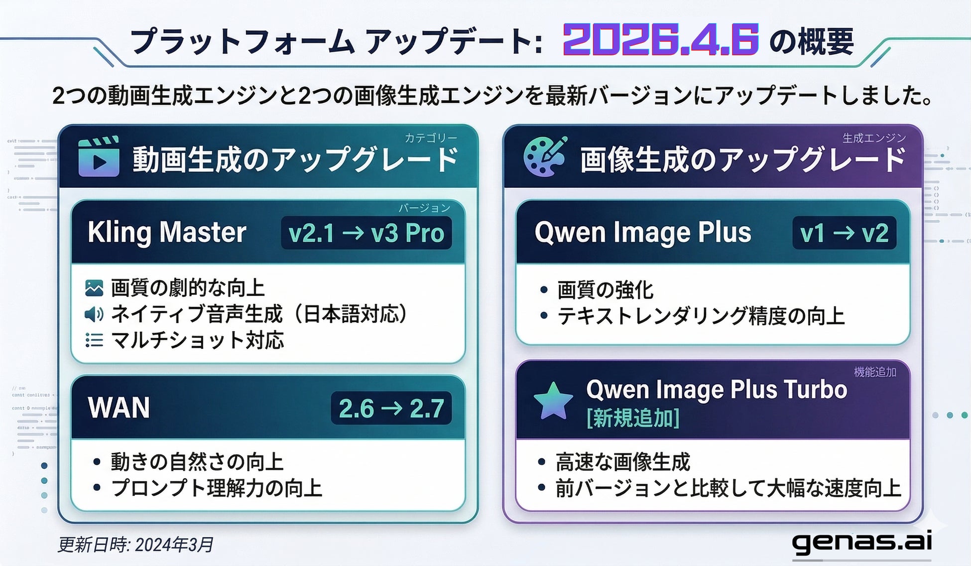 株式会社ニュウジア(本社:東京都中央区、代表取締役:柏口之宏)は、同社が運営するAI動画・画像・音声生成のワンストッププラットフォーム「genas.ai」(ジェナス・エーアイ)において、2026年4月4日(金)に主要AIエンジンの大規模アップグレードを実施したことをお知らせいたします。
