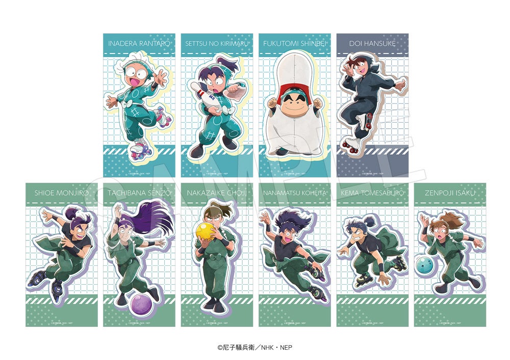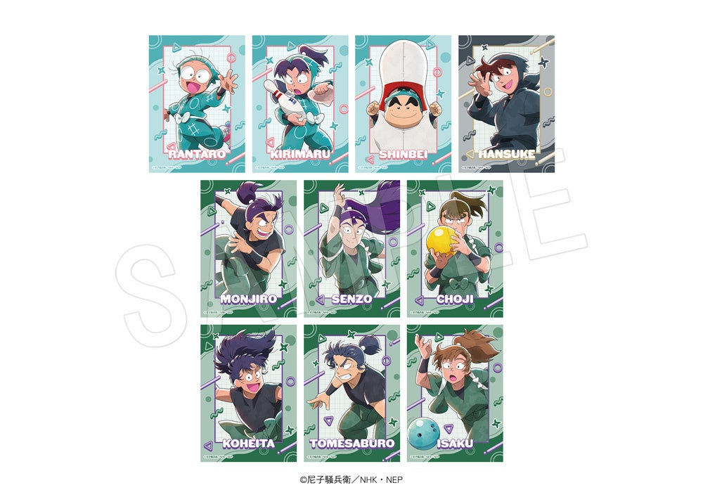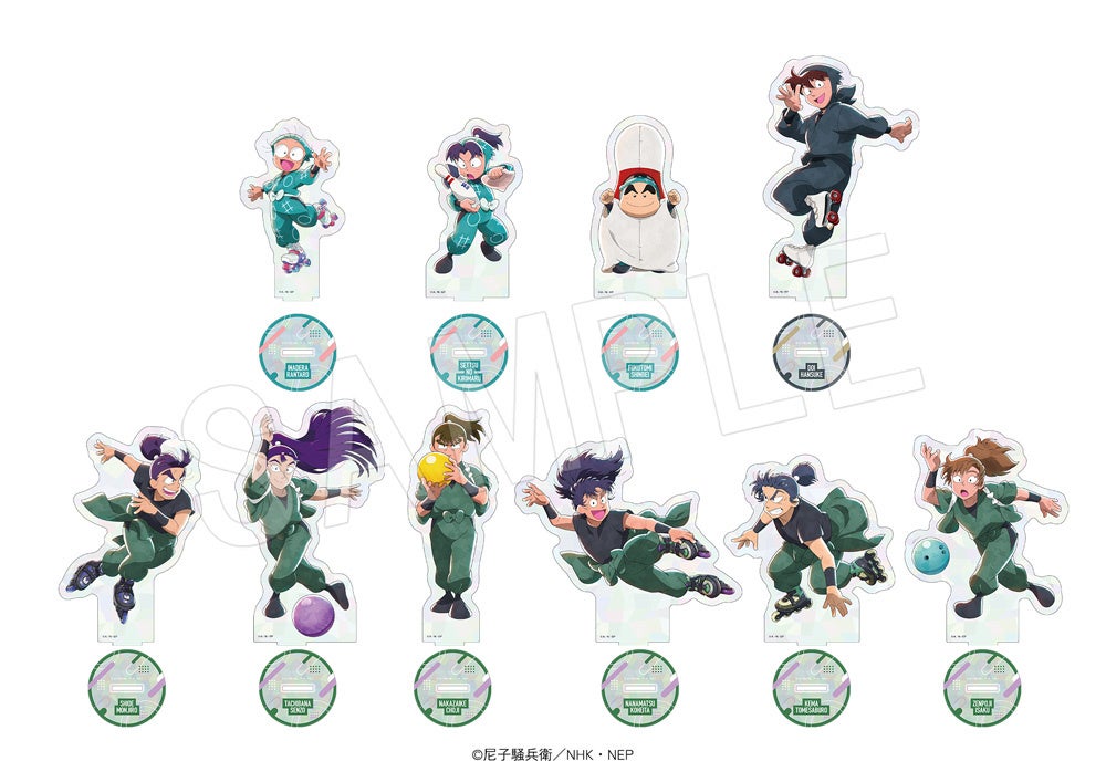 ボウリングやローラースケートを楽しむ乱太郎たち10名の新規描き下ろしイラストを使用した「アクリルフィギュアスタンド」や「ミニ缶バッジ付き マグネット缶キャラメル」のほか、カプセルトイの「フレークシール」やクレーンゲーム景品の「フェイスタオル」など、コラボならではの新作アイテムが登場!
