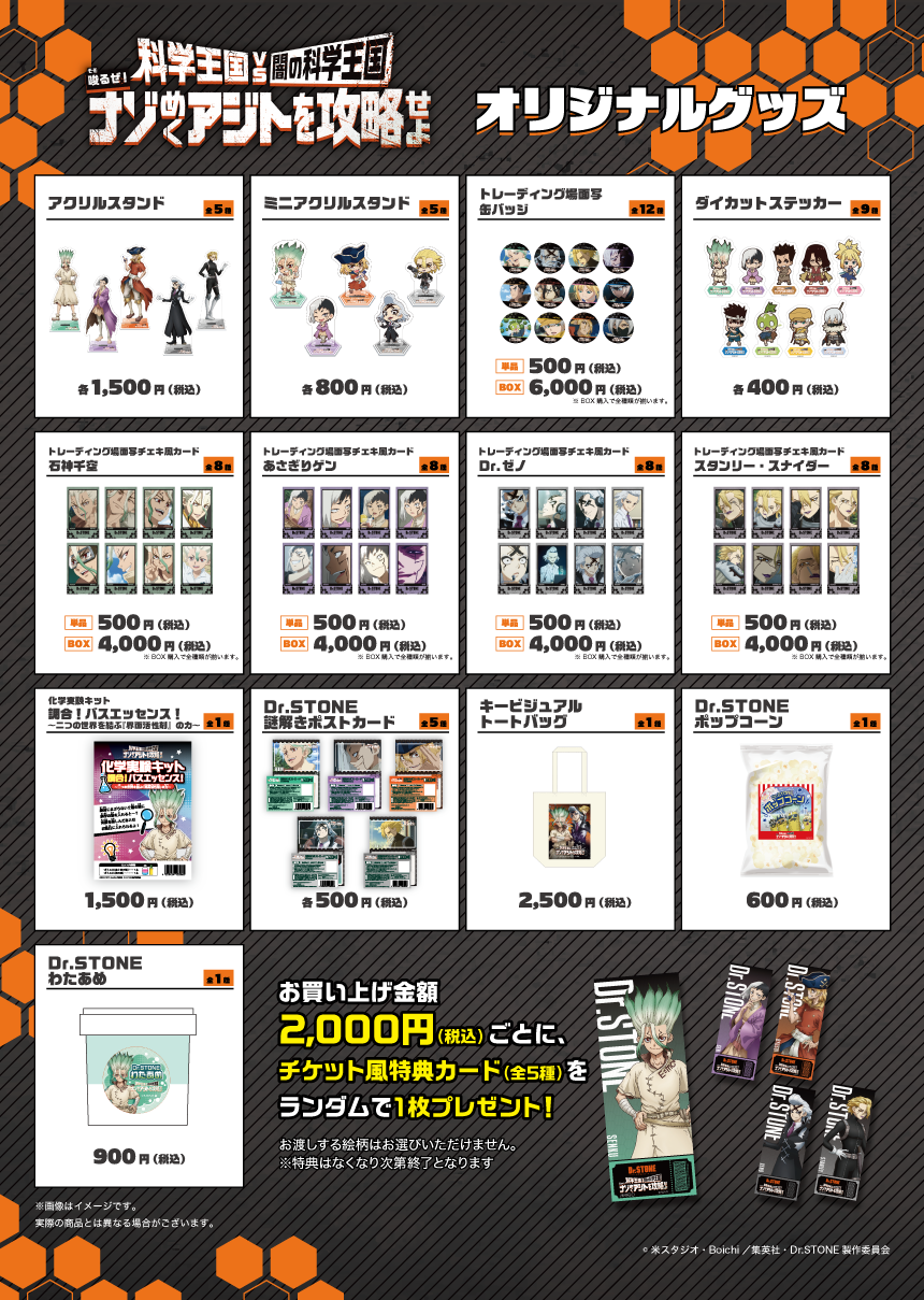 TVアニメ『Dr.STONE』のキャラクターイラストを使用したアクリルスタンドや缶バッジ、チェキ風カード、ステッカーなど、多彩なグッズを展開します。