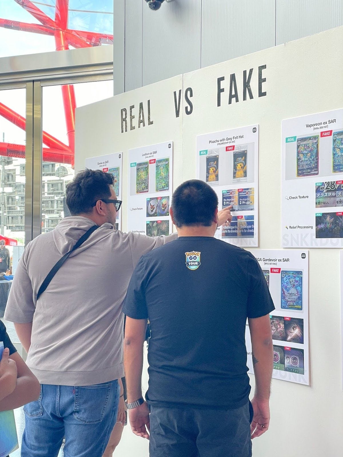 ポケモンカードの正規品と偽造品を比較した8種類のパネルを展示。各パネルの下部には、来訪者が違いを一目でわかるように、正規品と偽造品の真贋鑑定ポイントを大きく掲載しました。また、日本で流通している実物の正規品と偽造品のサンプル展示が会場内の注目を集め、来訪者からは、「本物と並べて比較する機会は今回が初めてだった」「こんなに偽造品が巧妙に作られているとは知らなかった」「個人では見分けがつかないと思う。日本の鑑定技術は非常に優れている」と多くの関心の声をいただき、偽造品の最新情勢をリアルに体感いただけるパネル展示となりました。