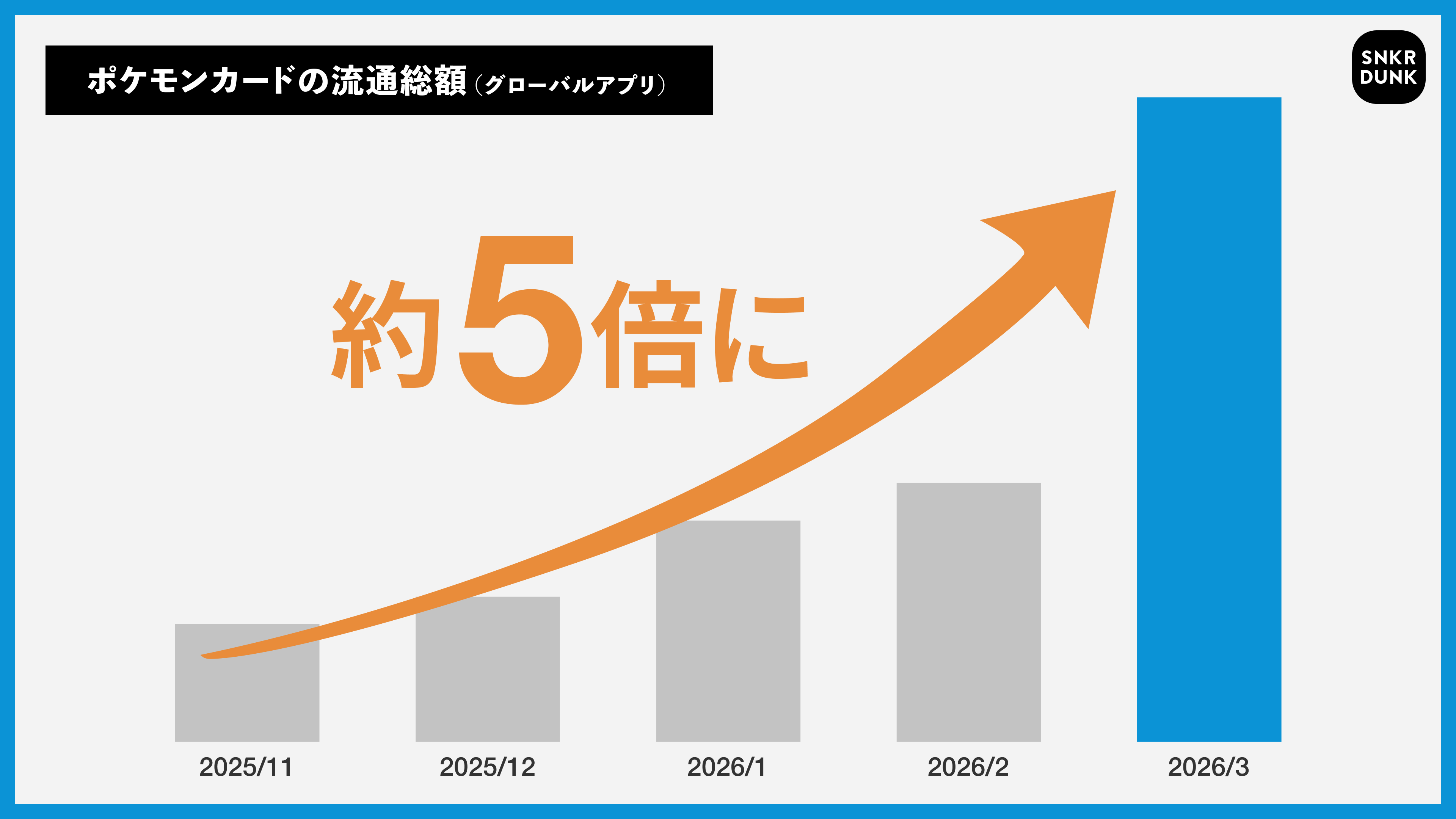 さらに、「ポケモン」は2026年2月に30周年を迎え、ポケモンカードの熱気がさらに高まっています。この影響もありスニダン グローバルアプリにおけるポケモンカード流通取引総額は、2025年11月から2026年3月の5ヶ月間で、約5倍に増加しており、ポケカファンの熱量が、より一層高まっていることが伺えます。