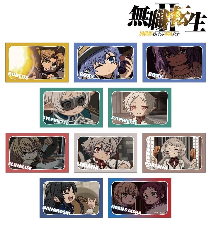 ルーデウス・グレイラット、ロキシー・ミグルディア、シルフィエット、エリナリーゼ・ドラゴンロード、リニアーナ・デドルディア、プルセナ・アドルディア、ナナホシ、ノルン・グレイラット、アイシャ・グレイラットの印象的なシーンをそのままデフォルメで再現し、イラストカードに仕上げました。