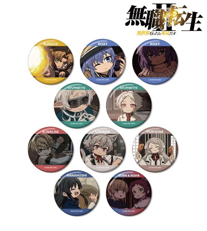 ルーデウス・グレイラット、ロキシー・ミグルディア、シルフィエット、エリナリーゼ・ドラゴンロード、リニアーナ・デドルディア、プルセナ・アドルディア、ナナホシ、ノルン・グレイラット、アイシャ・グレイラットの印象的なシーンをそのままデフォルメで再現し、缶バッジに仕上げました。