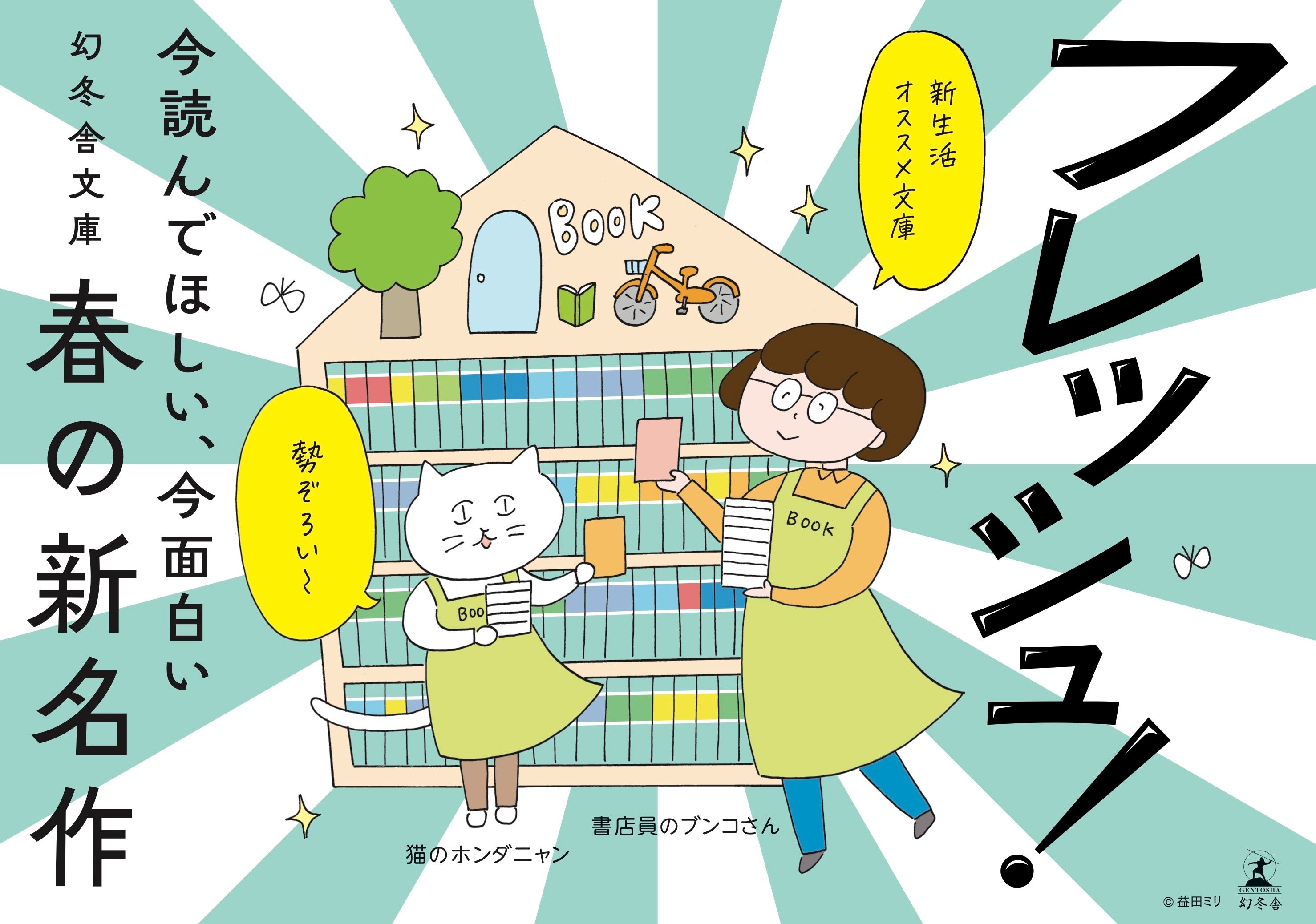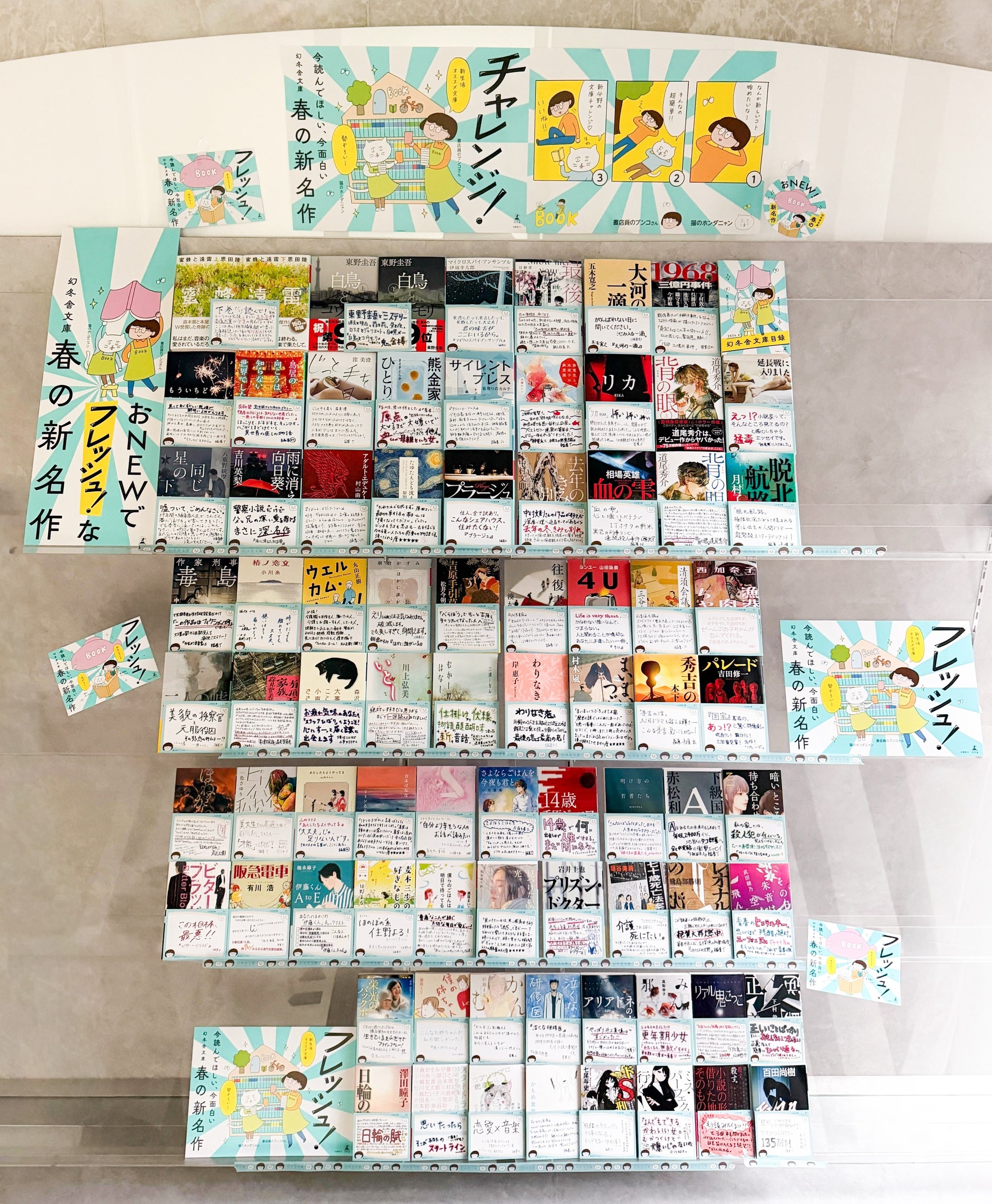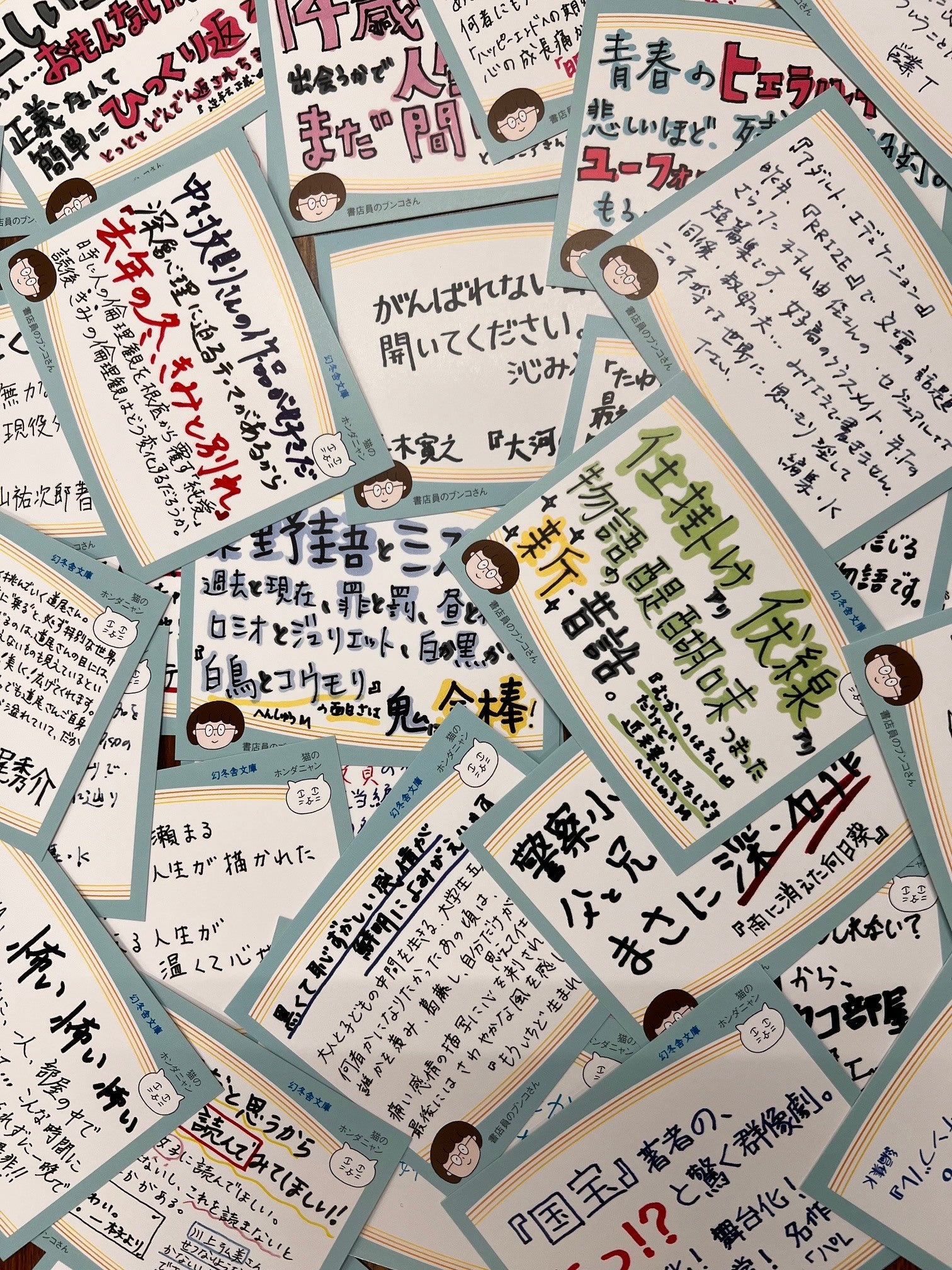 また、80作品すべてに”手書きPOP”を制作。一冊一冊に込められた熱い想いをそのままお届けします。幻冬舎文庫のアンバサダーを勤めるブンコさんとホンダニャン(©️益田ミリ)と幻冬舎文庫の背の色であるブルーのフレッシュなビジュアルが目印です。
