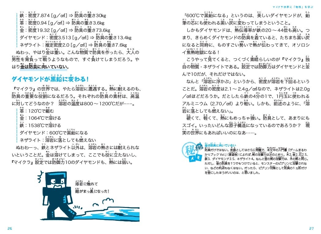 たとえば『マインクラフト』の世界で最強クラスの素材として扱われるダイヤモンド。「硬い=強いのか?」「防具に必要な“強さ”とは何なのか?」といった視点から、密度・融点・壊れ方など、複数の条件を置き換えながら検証を重ねていきます。このテーマを通じて物の物理的性質「物性」学ぶことで、ゲームの世界が現実とどう違い、どこが同じで、なぜ“そうせざるをえないのかが、見えてきます。