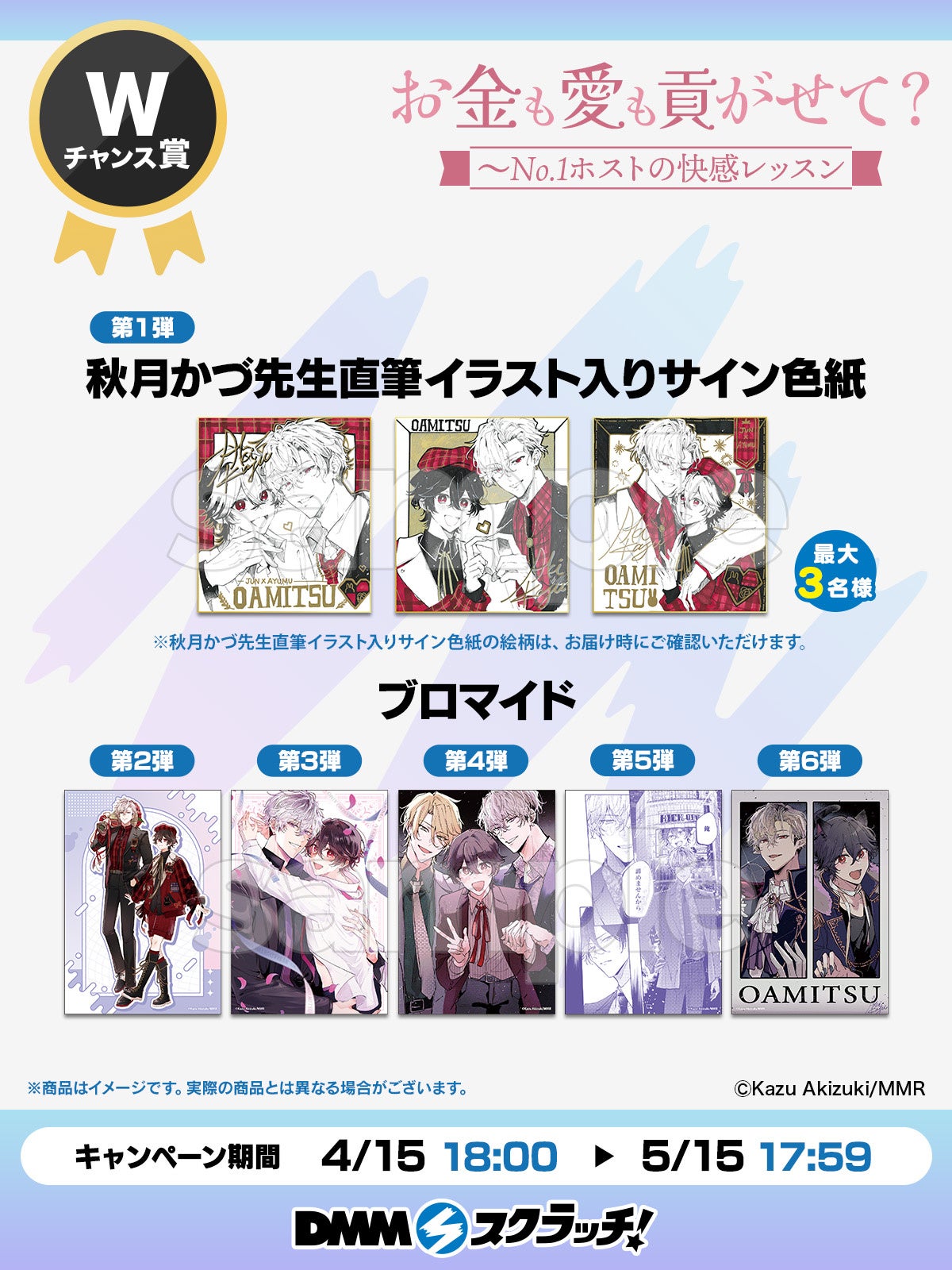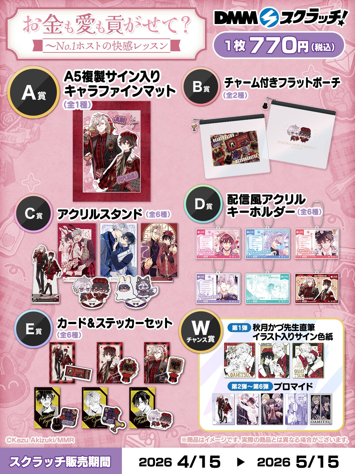 本スクラッチでは、秋月かづ先生(@akiduki_kd)の描き下ろしイラストを使用したグッズをはじめ、DMMスクラッチ限定アイテムなど、多彩な賞品ラインナップを予定しております。