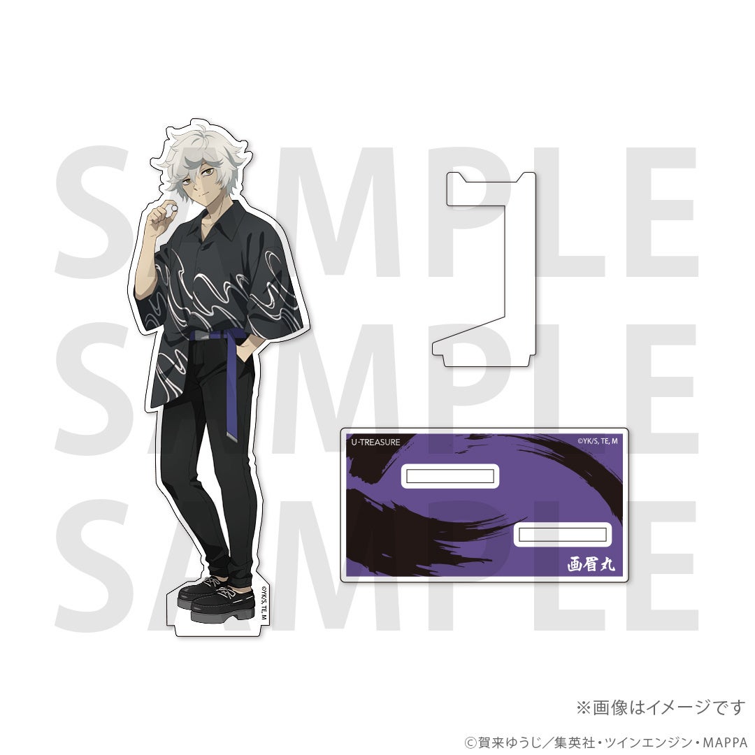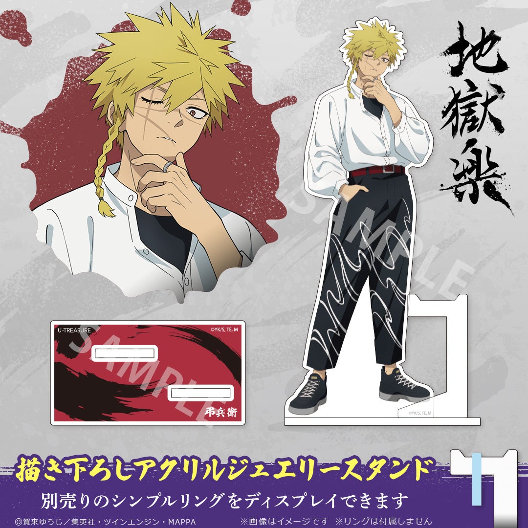 このたびの新作は、TVアニメ『地獄楽』の「画眉丸」「弔兵衛」の描き下ろしイラストを使用したアクリルリングスタンドです。別売りの「モチーフリング」をディスプレイできる仕様です。