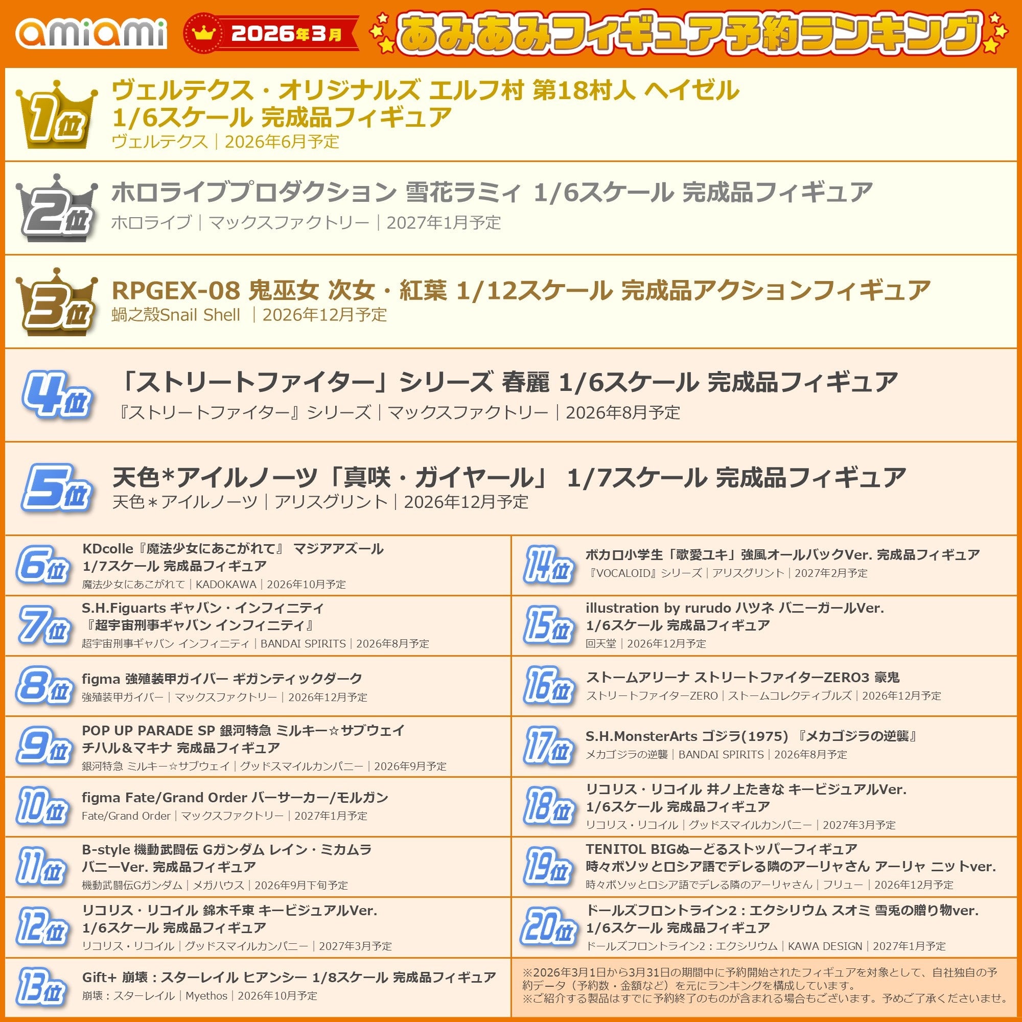大網株式会社(東京都文京区)は、自社が運営するホビーショップ『あみあみ』の2026年3月フィギュア予約ランキングを発表いたしました。
