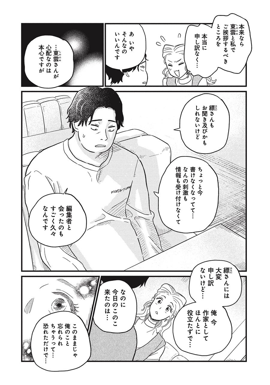 主人公は、デビュー作のヒット後に無気力となり、書けなくなってしまったスランプ小説家・空五倍子唯生(うつぶし ただお)。新たに担当となった新米文芸編集・縹(はなだ)ちとせが提案する型破りなリハビリプランに振り回されながらも再び書くことに向き合い、新作執筆を目指す日々が始まります。