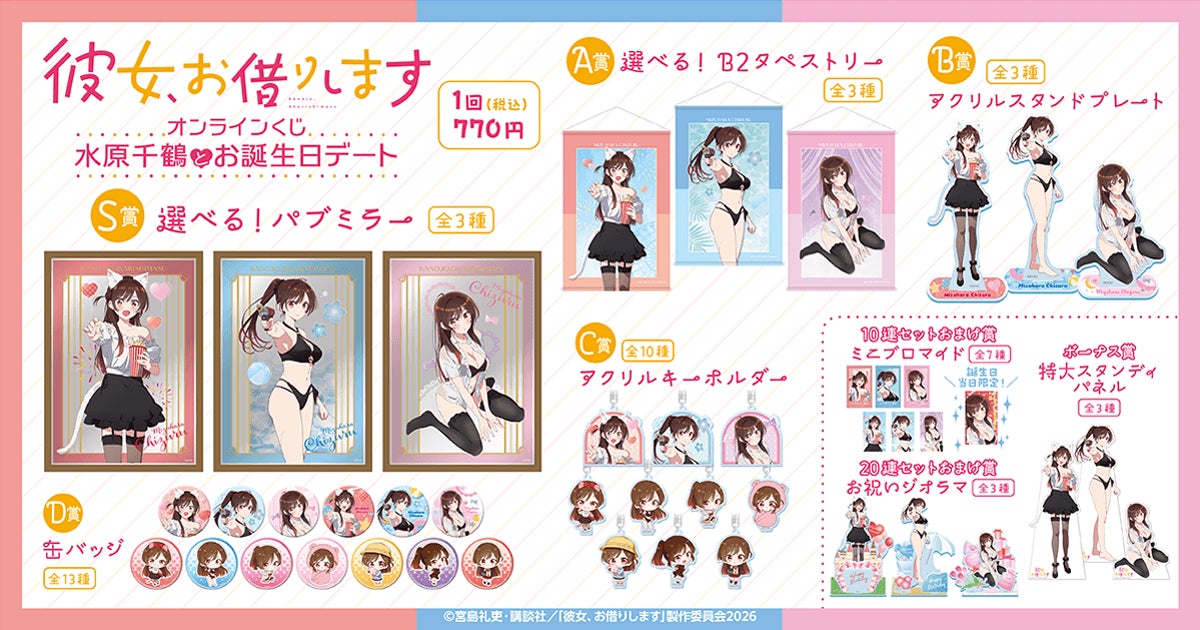 株式会社KADOKAWA(本社:東京都千代田区、取締役 代表執行役社長 CEO:夏野 剛、以下 KADOKAWA)は、運営するオンラインくじサービス「くじ引き堂」において、『彼女、お借りします』の豪華賞品が手に入る<「彼女、お借りします」オンラインくじ 水原千鶴とお誕生日デート>を、2026年4月16日(木)12時より販売します。
