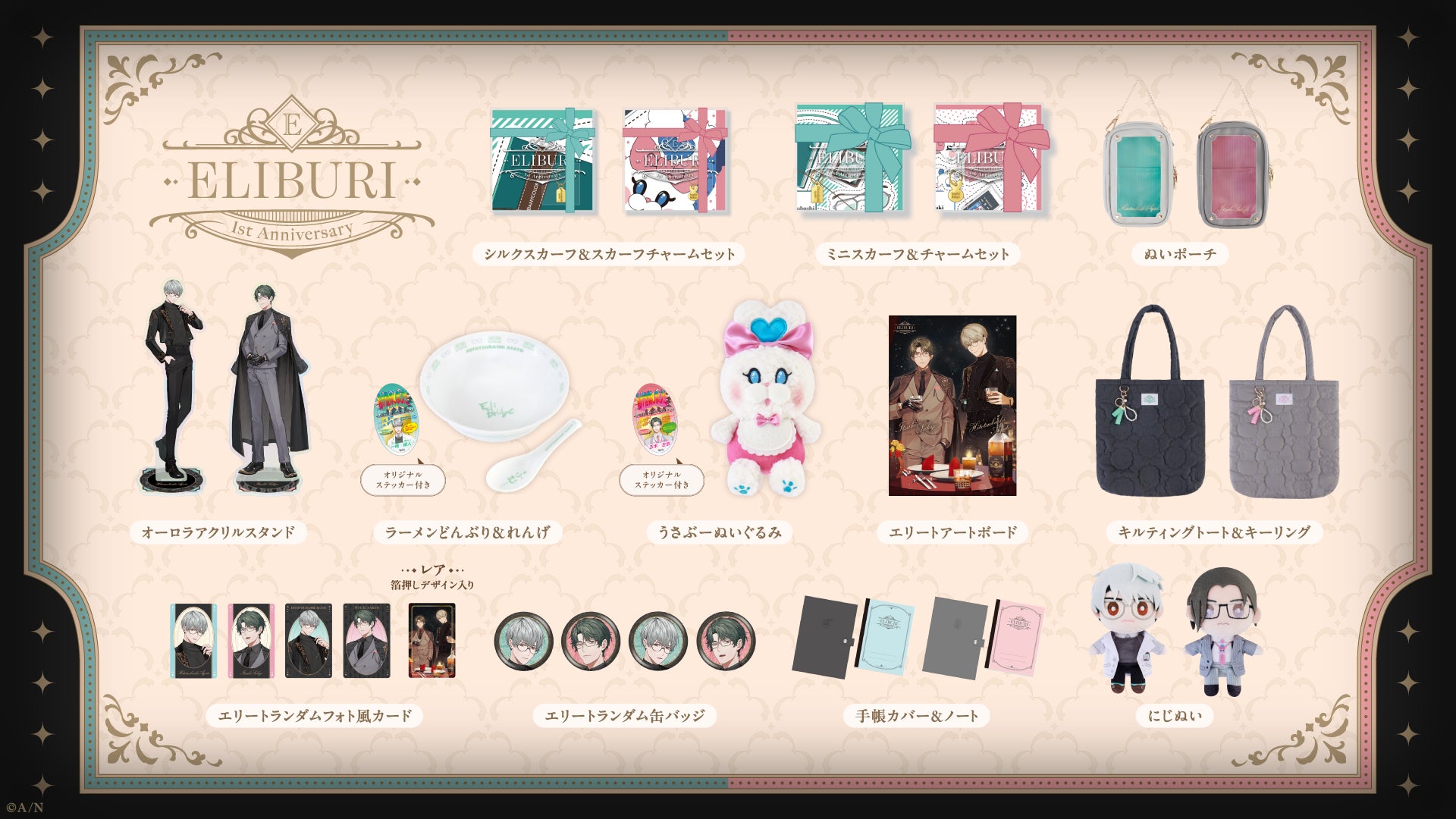 グッズラインナップはエリートランダムフォト風カード、エリートランダム缶バッジ、オーロラアクリルスタンド、シルクスカーフ&スカーフチャームセット、ミニスカーフ&チャームセット、手帳カバー&ノート、キルティングトート&キーリング、エリートアートボード、ラーメンどんぶり&れんげ(ステッカー付)、うさぶーぬいぐるみ(ステッカー付)、ぬいポーチ、 にじぬいの12種類!