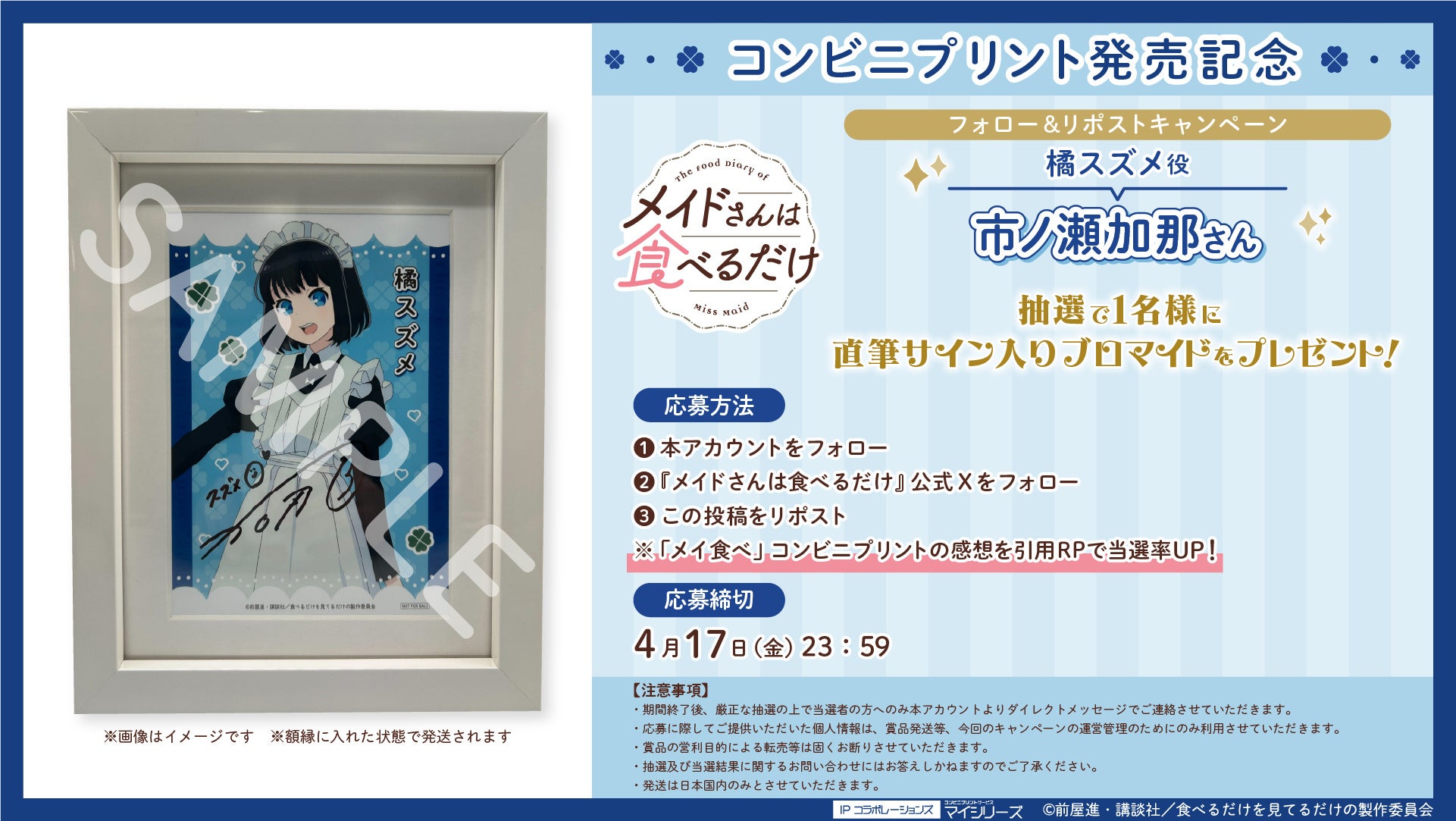 フォロー&リポストで、橘スズメ役・市ノ瀬加那さんの直筆サイン入りブロマイドが抽選で1名様に当たるキャンペーン実施中!