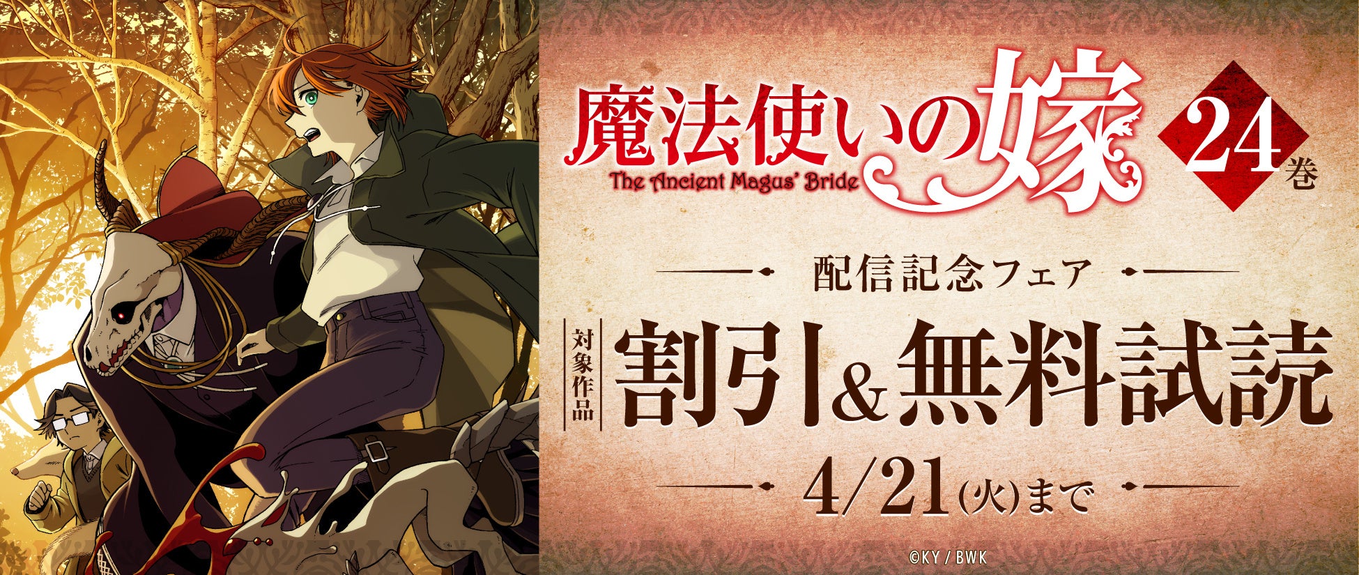 株式会社ブシロード(本社:東京都中野区、代表取締役社⻑:木谷高明、以下ブシロード)のグループ会社にあたる株式会社ブシロードワークス(本社:東京都中野区、代表取締役社長:新福恭平)は、『魔法使いの嫁 24』ならびに『魔法使いの嫁 24 ヤマザキコレ描き下ろし小冊子付き特装版』の発売を記念した電子書籍フェアをWEBマンガサイト「コミックグロウル」、または各電子書店にて開催中です。