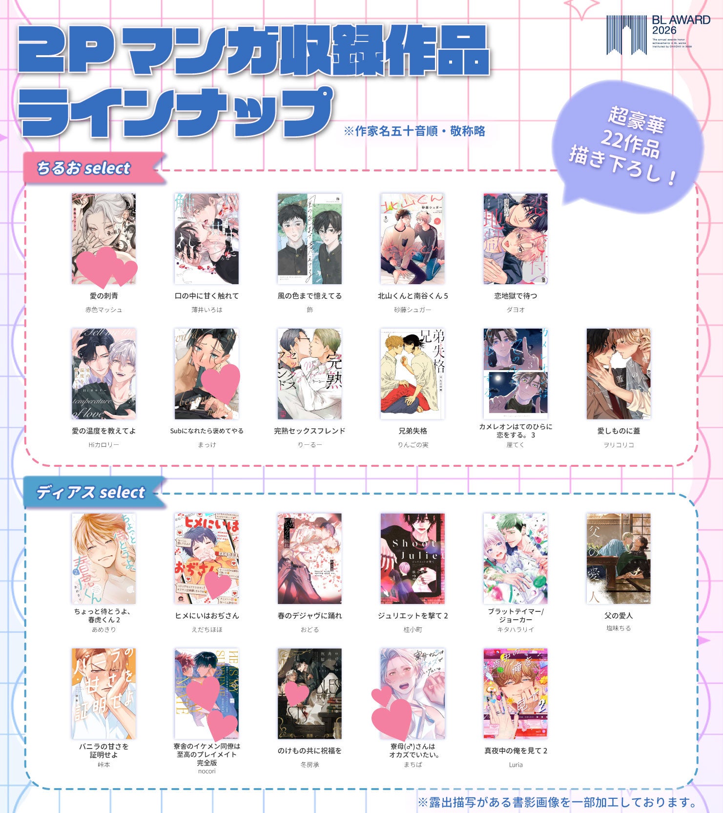 本小冊子ではBLアワード2026ノミネート作品の中から注目の22作品の2ページ描き下ろしマンガを収録。