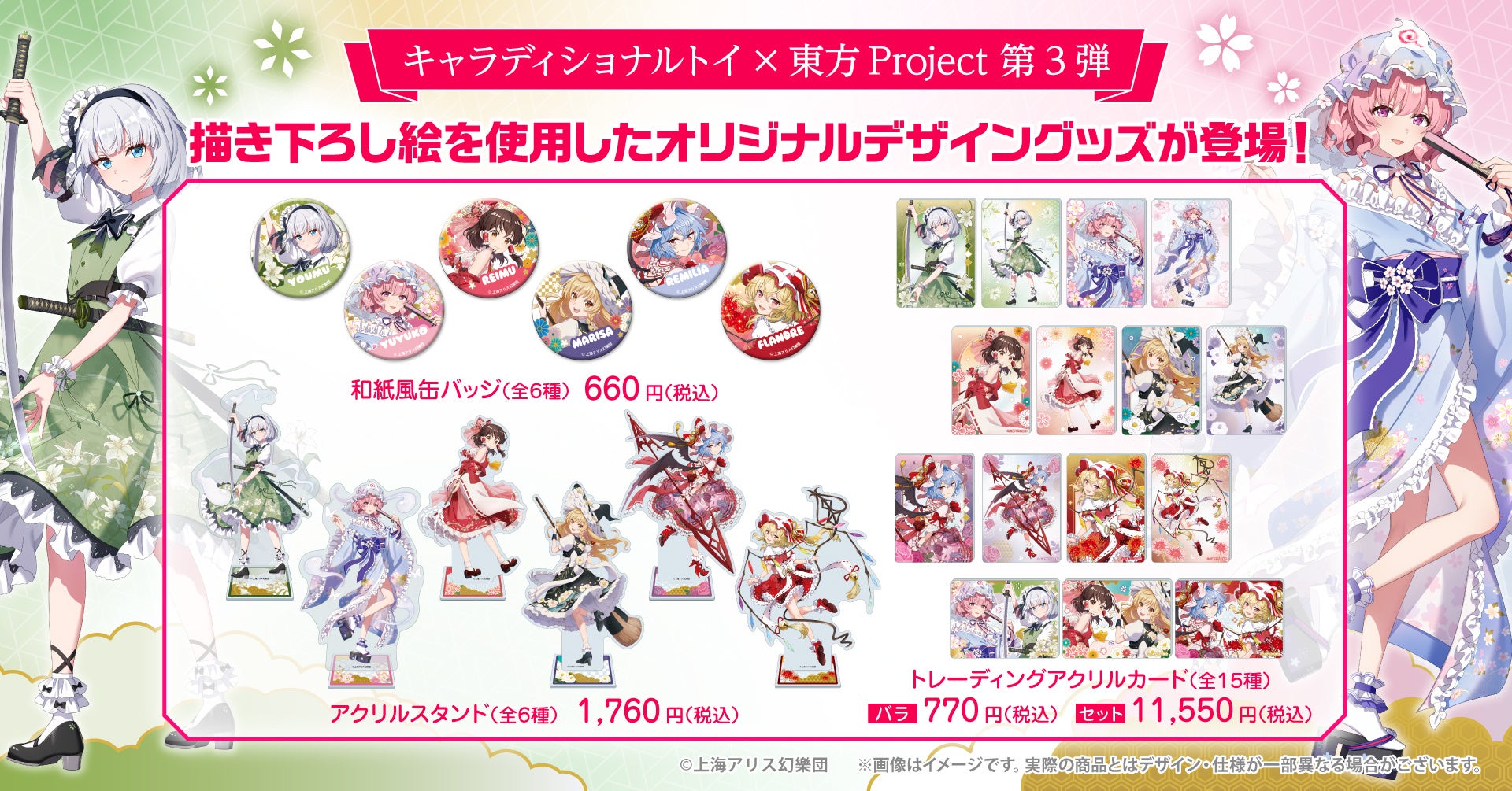 株式会社トキオ・ゲッツが展開する「キャラクター×日本の伝統」をテーマにしたブランド「キャラディショナルトイ」より、昨年発売した“見返り美人”をイメージした博麗霊夢・霧雨魔理沙・スカーレット姉妹のレミリア・フランドールに引き続き、魂魄妖夢・西行寺幽々子2名の新規描き下ろしイラストを加えた「東方Project」新商品が登場します。