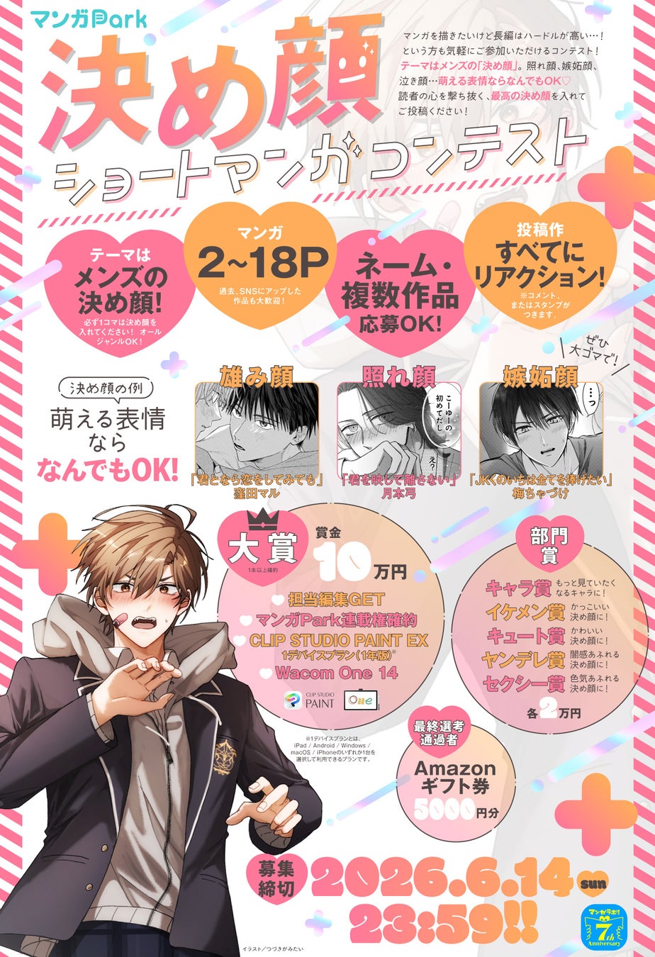 マンガを描きたいけど長編はハードルが高い…!という方も気軽にご参加いただけるコンテスト! テーマはメンズの「決め顔」。 照れ顔、嫉妬顔、泣き顔…萌える表情ならなんでも OK♡ 読者の心を撃ち抜く、最高の決め顔を入れてご投稿ください!