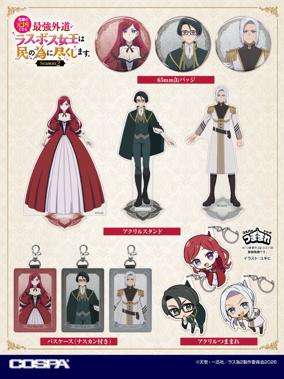 公式キャラクターコスチュームやアパレル・グッズの企画、開発、製造を行う株式会社コスパ(所在地:東京都渋谷区、代表取締役:松永芳幸)は、TVアニメ『悲劇の元凶となる最強外道ラスボス女王は民の為に尽くします。Season2』新グッズを発表した。