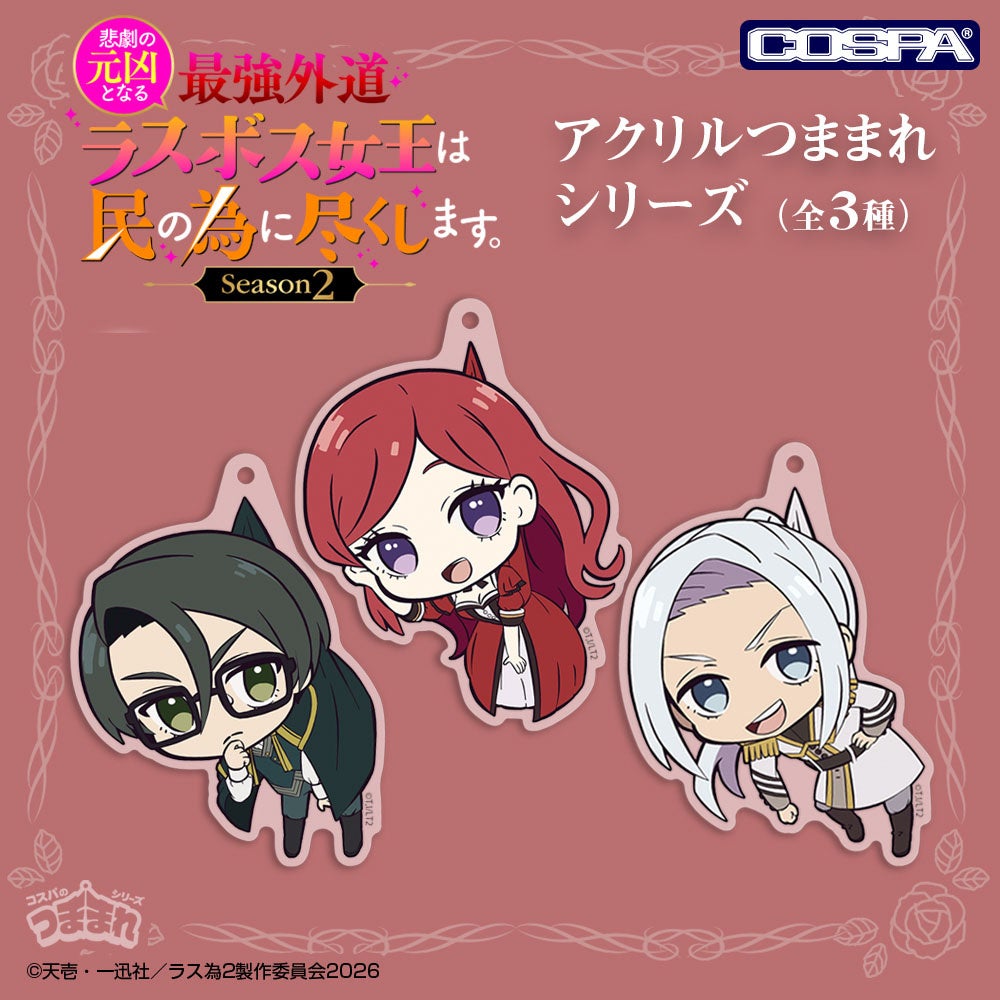 公式キャラクターコスチュームやアパレル・グッズの企画、開発、製造を行う株式会社コスパ(所在地:東京都渋谷区、代表取締役:松永芳幸)は、TVアニメ『悲劇の元凶となる最強外道ラスボス女王は民の為に尽くします。Season2』新グッズを発表した。