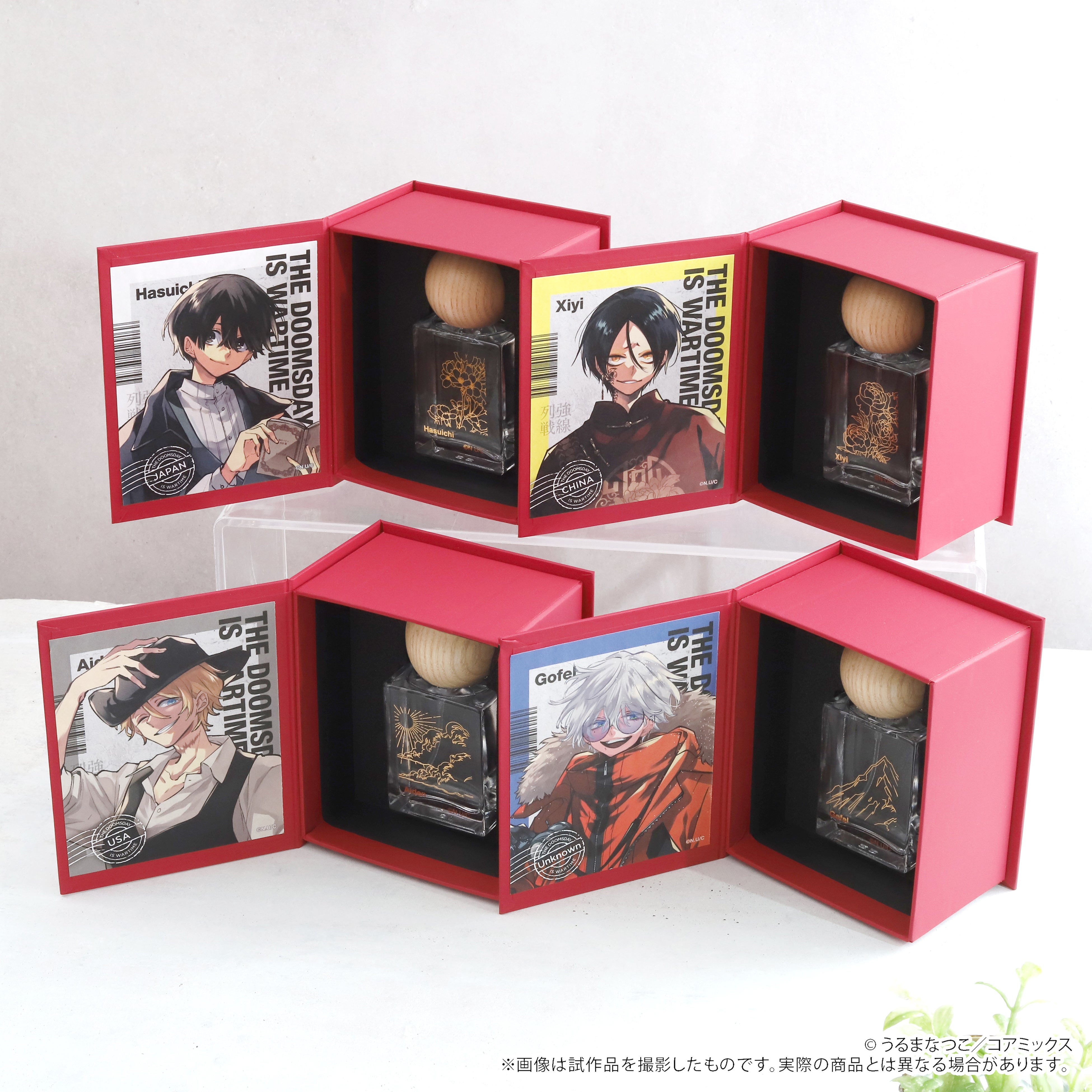 各キャラクターをイメージした「フレグランス」が登場!うるまなつこ先生から各キャラクターのイメージをいただき、個性や魅力を詰め込み香りに落とし込みました。インテリアにも馴染むシンプルなパッケージには上品にきらめく箔押しのアクセントを。更に…豪華!先生描き下ろしのイラストカードをお付けしてのお届けです。