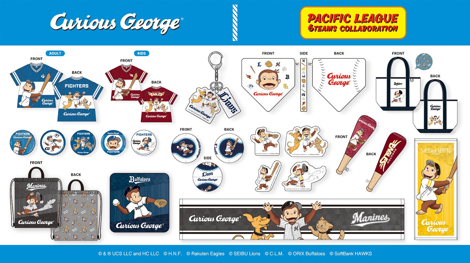 「おさるのジョージ」は、世代を超えて愛され続け、2026年で誕生85周年を迎える人気キャラクターです。パ・リーグ6球団とのコラボレーションは、2024年、2025年に続き今年で3回目の実施となります。これまで大きな反響をいただいたことを受け、2026年も「おさるのジョージ」が各球団のユニフォームやキャップを着用し、野球を楽しむイラストを用いた新作コラボグッズを展開いたします。アニバーサリーイヤーにふさわしい、特別感あふれるラインナップにぜひご期待ください。また、コラボグッズの発売を記念して、パ・リーグ5球場へジョージが来場し、撮影会などを実施予定です。球場で見せるジョージのかわいらしい姿にも、ぜひご注目ください。