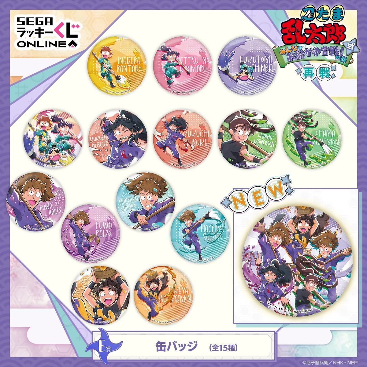 本くじは、2024年4月に発売されたセガ ラッキーくじオンライン「忍たま乱太郎 みんなでお絵かき合戦!の段 弐」の一部賞品のラインナップをリニューアルして販売されるオンラインくじです。前回も好評いただきました「アクリルスタンド」や「マルチクロス」、「クリアバッグ」のほか、新規デザインを含む「缶バッジ」や新規賞品である「マフラータオル」などラインナップが追加されリニューアルしています。