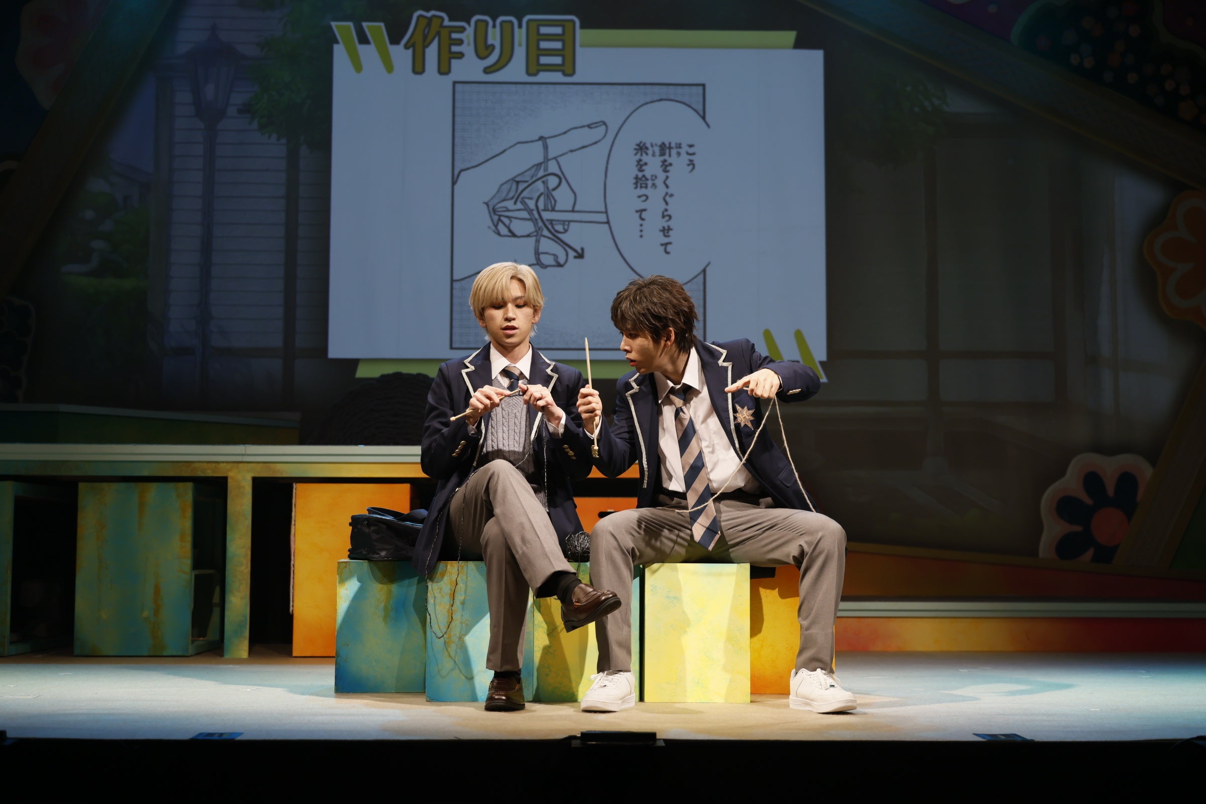 舞台化が発表されてから気になっていたのが、編み物を舞台上でどう表現するかという点だ。本作ではキャストが舞台上で実際に編み物をするという、シンプルでいてこの作品らしい手法で表現されていた。健斗が初めて棒針やかぎ針に挑戦する際は、背景スクリーンにコミックスの該当シーンのコマが表示されるというのも、メディアミックスならでは。
