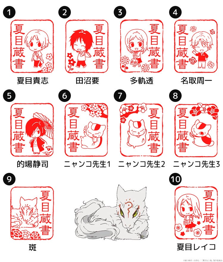ニャンコ先生はもちろん、ニャンコ先生の本来の姿である斑(まだら)や物語の主人公である夏目貴志や友人たちまで。コミックや愛読本はもちろんお手紙にも使える、古き良き時代のハンコです。