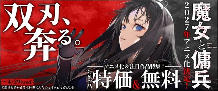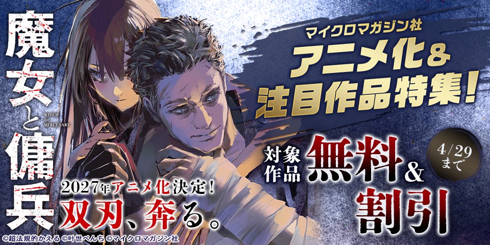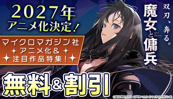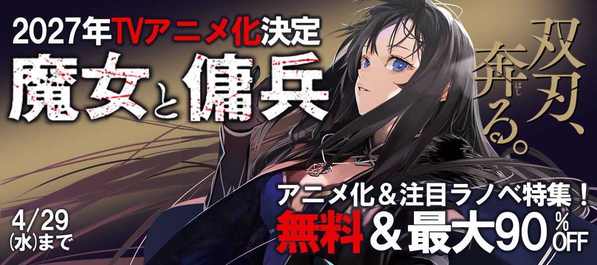 原作小説・コミカライズともに大好評の『魔女と傭兵』がついに2027年アニメ化決定。シリーズ累計発行部数も150万部を突破し、全国の書店と電子書籍ストアではアニメ化記念フェアを開催いたします。