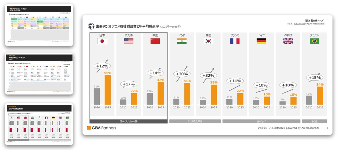 エンタテイメント業界に向けたデータ×デジタルマーケティングサービスを提供するGEM Partners株式会社(ジェムパートナーズ、本社:東京都港区、代表取締役:梅津文)は4月16日(木)、グローバル市場でのアニメファンの動向を可視化した「アニメグローバル白書2026 powered by Animeasure® アニメの世界拡大と熱狂のトレンド 2020-2025」の販売を開始いたしました。
