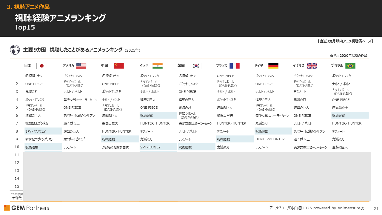・日本・中国・韓国で過去最も視聴されたタイトルは『名探偵コナン』。日本では15位の『ナルト/ボルト』が、他国では広く上位にランクイン。