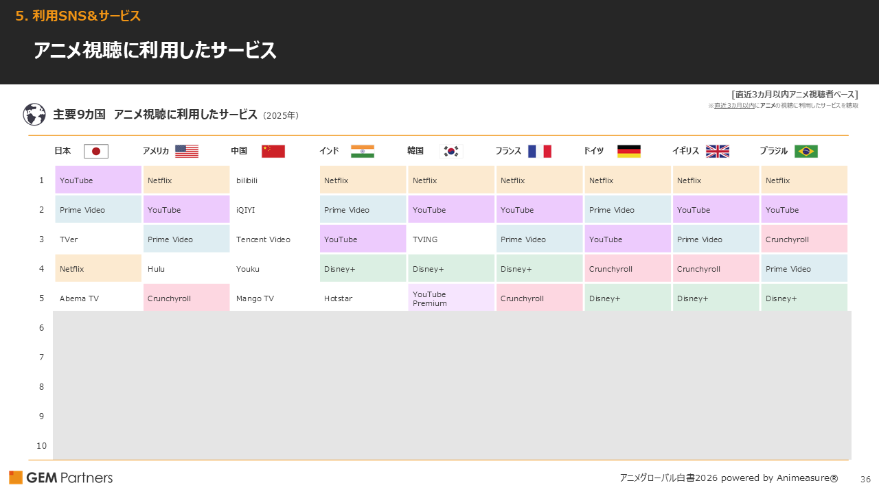 ・日本・中国・韓国以外では「Crunchyroll」がTOP10入り。