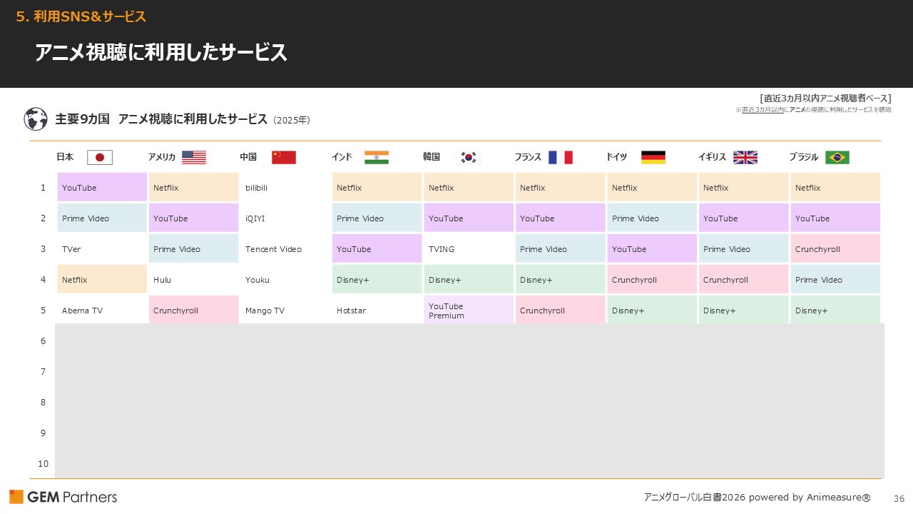 ・アニメ視聴に使用したサービスは、「Netflix」が日本と中国以外でトップ。「Prime Video」「YouTube」も多くの国で上位にランクイン。