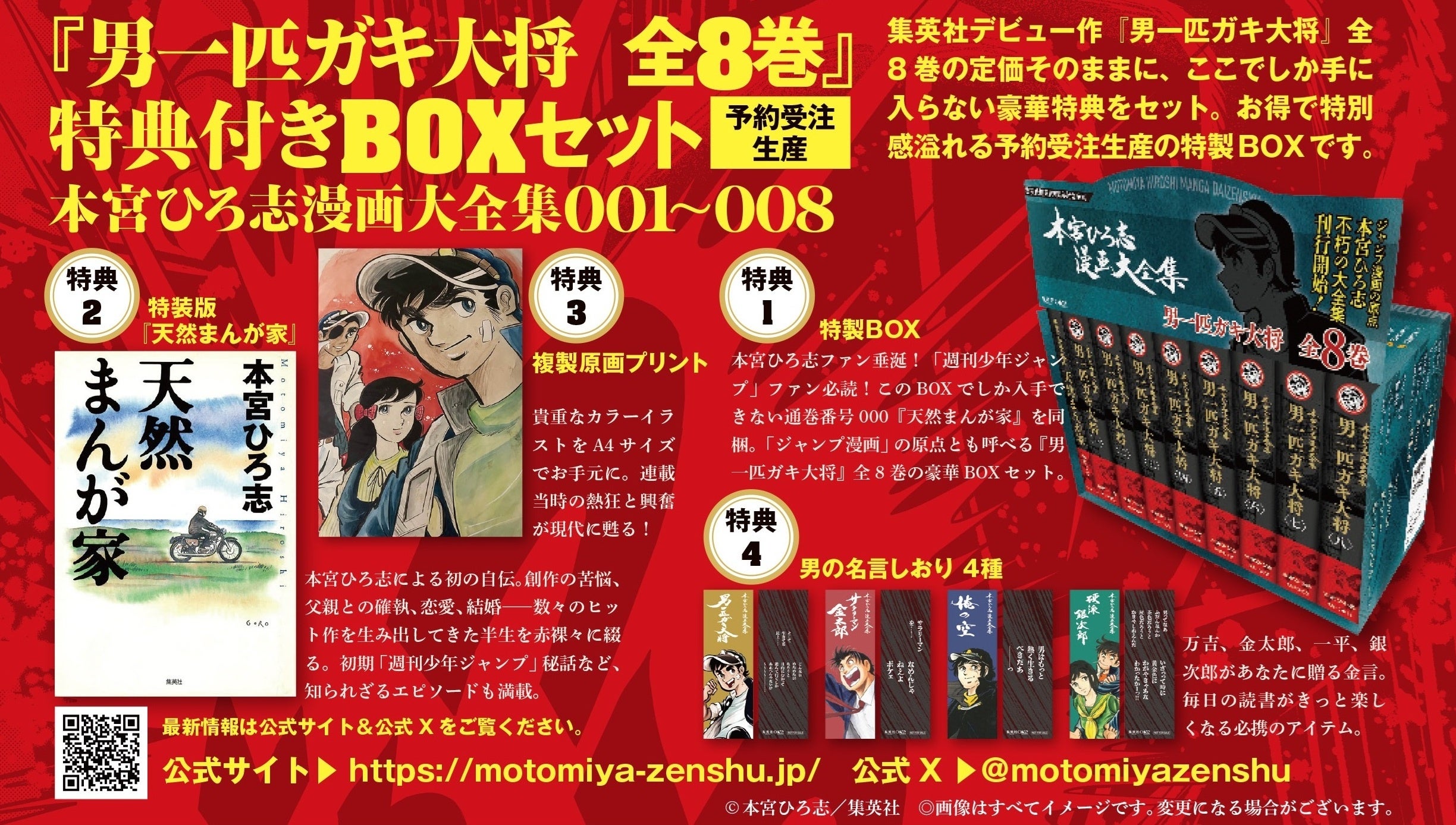 『本宮ひろ志漫画大全集』の第1弾刊行となる『男一匹ガキ大将』については、11月19日(木)の通常の各巻での販売に加え、予約受注生産商品として<『男一匹ガキ大将 全8巻』特典付きBOXセット本宮ひろ志漫画大全集 001~008>の発売を決定。定価23,760円(10%税込)と、『男一匹ガキ大将』全8巻の定価そのままに、豪華特典4点をセットにした特別商品です。特典内容は、①特製BOX②特装版『天然まんが家』(本宮ひろ志漫画大全集000)③複製原画プリント④男の名言しおり4種(万吉、金太郎、一平、銀次郎)です 。『天然まんが家』は本宮ひろ志氏による初の自伝エッセイで、創作の苦悩、父親との確執、初期「週刊少年ジャンプ」秘話など知られざるエピソードが満載の貴重な一冊です。さらに今回の特装版では、本宮氏が新たに書き下ろした1編を収録した特別仕様です。この商品の予約受注を2026年4月17日(木)から2026年8月2日(日)まで全国の書店で受付中です。