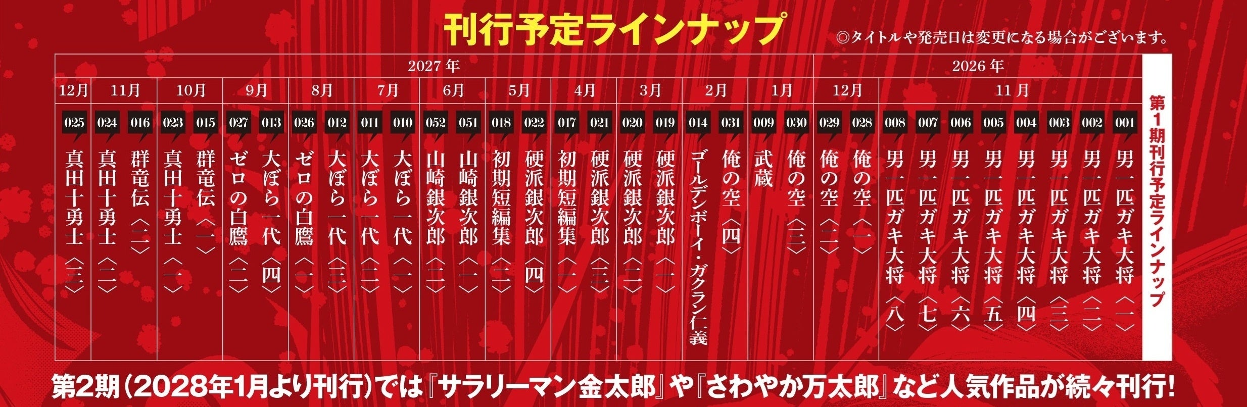 集英社創業100周年記念企画として、『本宮ひろ志漫画大全集』を2026年11月19日(木)より刊行開始します。連載73作・読切38作(2026年4月時点)、総原稿数はおよそ65,000ページに及び、巻数152巻超(予定)にのぼる本宮氏の60年超の画業を完全収録する壮大なプロジェクトです。A5判の豪華&極厚仕様で、最新技術のデジタル製版により熱を帯びたペン線を生き生きと復刻し、巻末にはマンガ解説者・南信長氏による作品解説や各界著名人による豪華解題を収録いたします。第1期は、『男一匹ガキ大将』をはじめ、『俺の空』『硬派銀次郎』などを、2026年11月から2027年12月まで計33巻刊行予定。第2期(2028年1月より)では『サラリーマン金太郎』や『さわやか万太郎』など人気作品が続々刊行予定です。