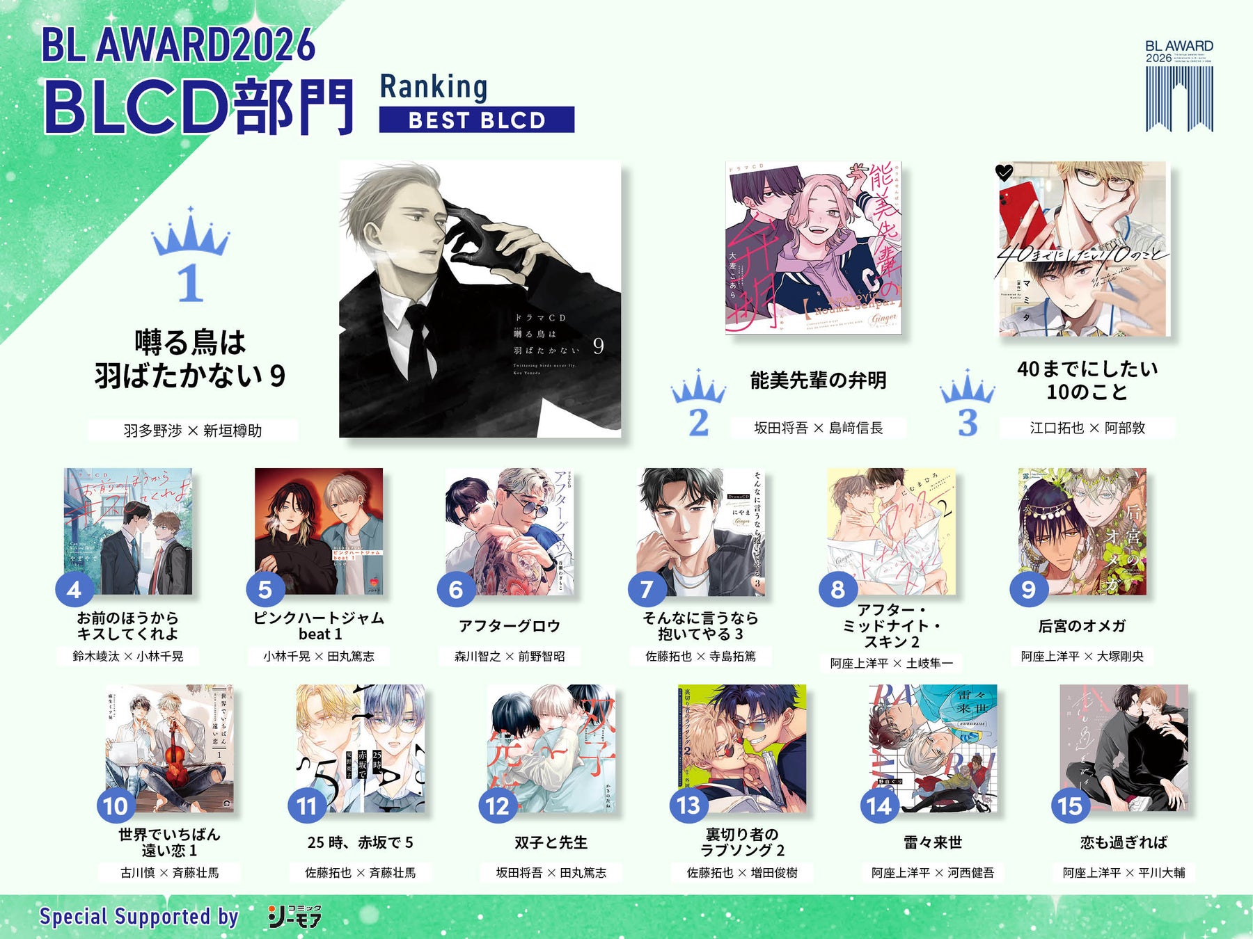 ちるちるでの評価得点を基準に、BLCDを含むオーディオドラマ作品から選ばれます。