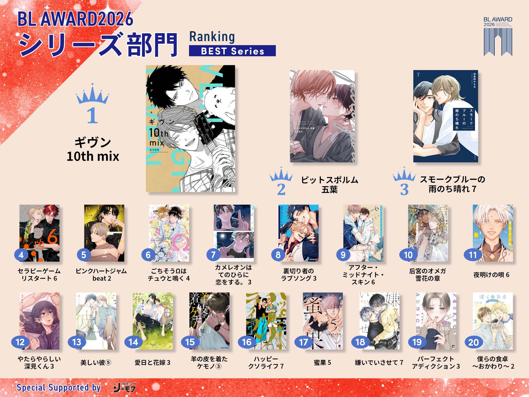 今回のBLアワード2026では、『太郎 DON’T ESCAPE!』(mememe)を筆頭に、全世代からの人気を集めるメガヒット作品の台頭が見られました。シリーズ部門1位に輝いた『ギヴン 10th mix』(キヅナツキ)も同様に、幅広い世代からの絶大な支持を受け、メディアミックス等の影響を含めた作品のパワーを感じます。