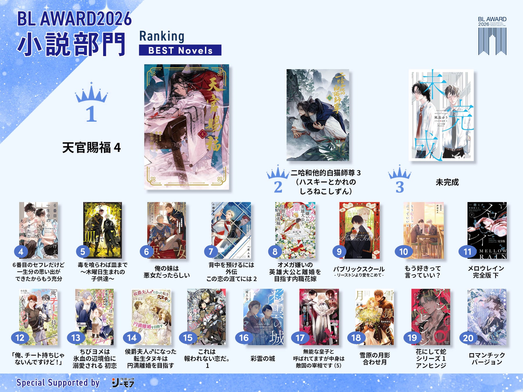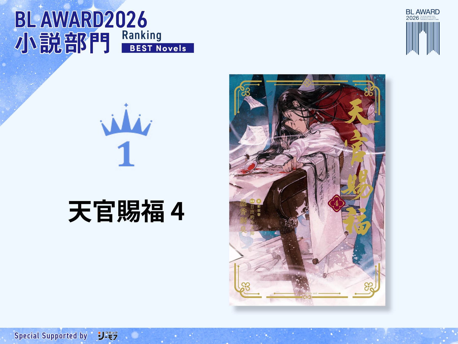 小説部門では、もはや不動の地位を築いている中華BLの金字塔『天官賜福 4』(墨香銅臭)が、圧倒的な支持を得て今年も1位に輝きました。壮大なスケールで描かれる世界観と、時を越えて紡がれる深い愛の物語が日本のBLファンの心を掴みつづけています。