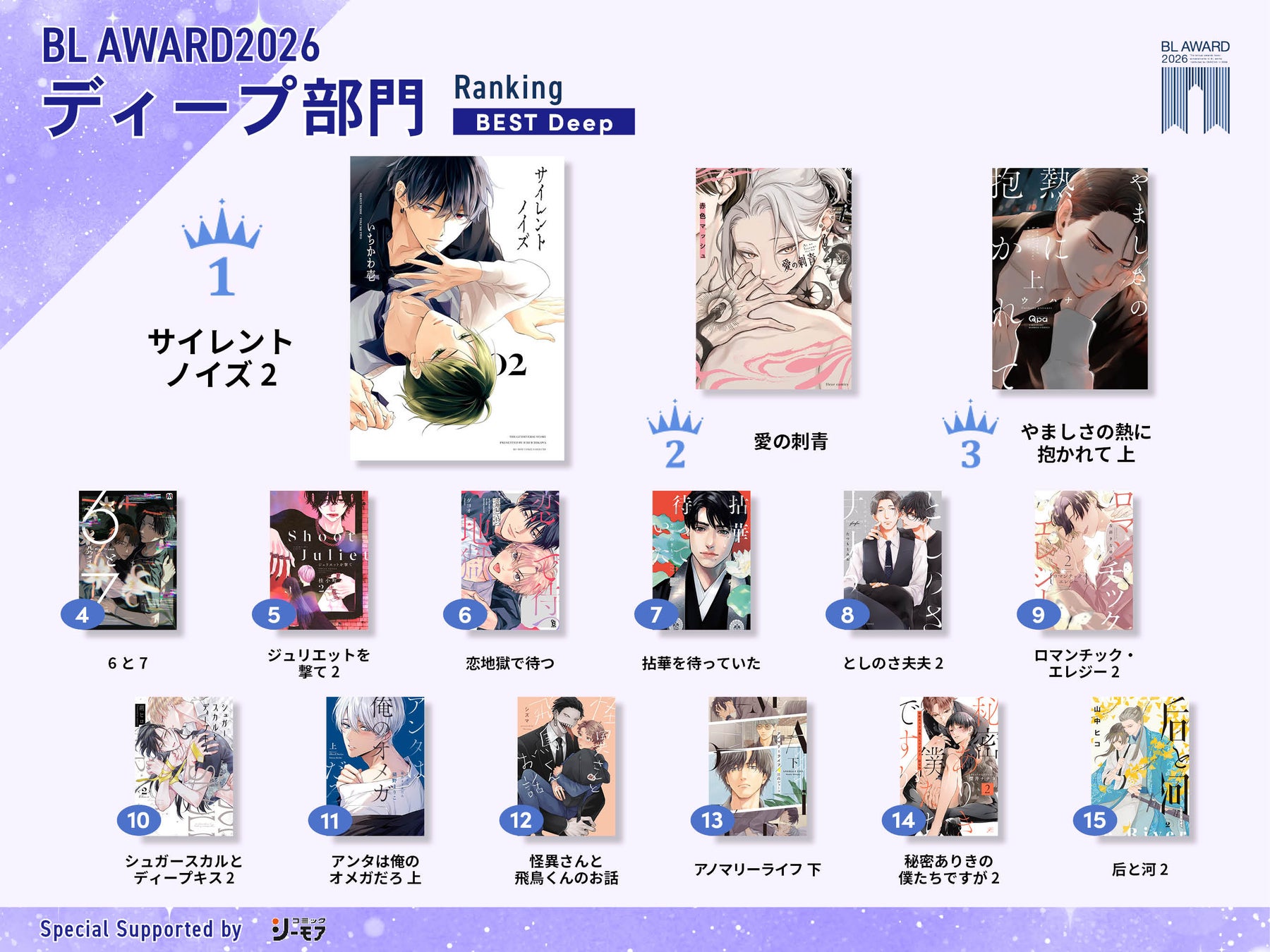 続く2位には、「Sub攻め×Dom受け」という斬新な設定で新鮮なときめきを与えた『ラブ・チェイン・ラブ・ジーン』(ヱビノびすく)、3位には、ライバル同士の2人が誠実に関係性を深めていく姿に思わず幸せを願わずにいられない『恋をするならひれ伏して』(ハルモト紺)がランクインしました。