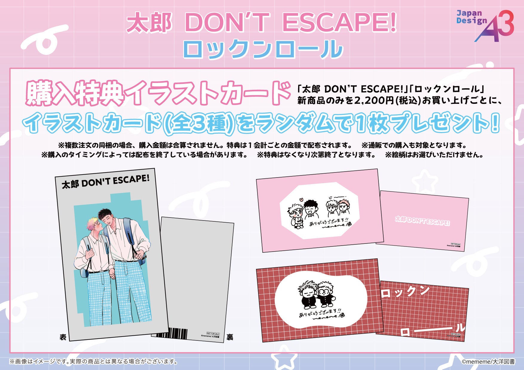 『太郎 DON’T ESCAPE!』『ロックンロール』の新商品のみを1会計2,200円(税込)お買い上げごとに、購入特典としてイラストカード(全3種)をランダムで1枚プレゼント!