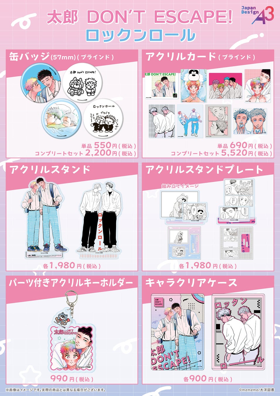 新作グッズには、『太郎 DON’T ESCAPE!』と『ロックンロール』の公式イラストはもちろん、mememe先生による貴重な描き下ろしイラストを使用したアイテムが6アイテム19種登場。