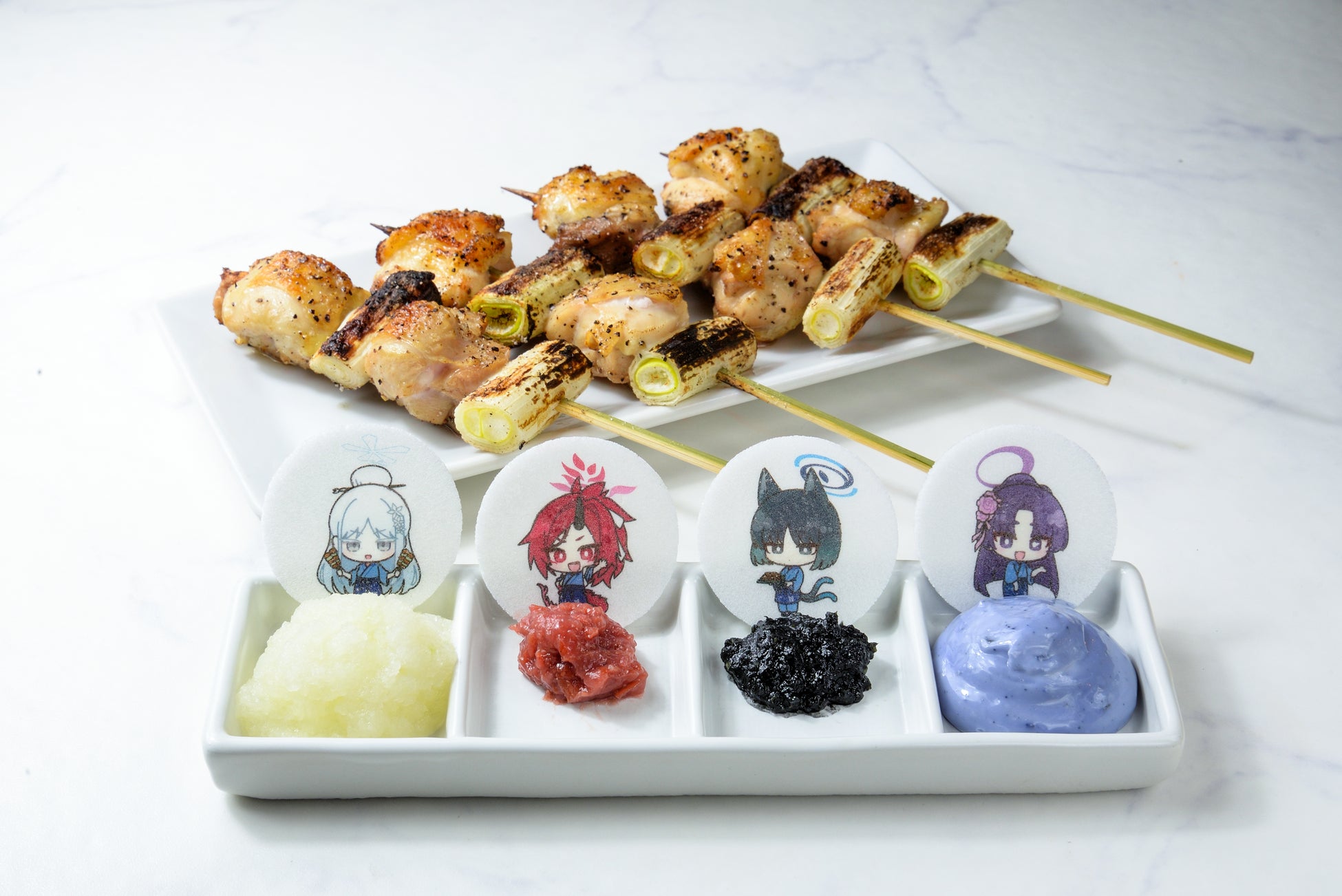 今回、「備長扇屋」「やきとりの扇屋」「本陣串や」と『ブルーアーカイブ』百花繚乱紛争調停委員会との至高のコラボレーションが実現。焼き鳥大好きなナグサをはじめ、作品の世界観をイメージしたコラボメニューが誕生しました。備長炭の熱に包まれ、秘伝のタレが香ばしい究極の一串。期間中、本企画オリジナルグッズも販売いたします。最高の「焼き」をお楽しみください。
