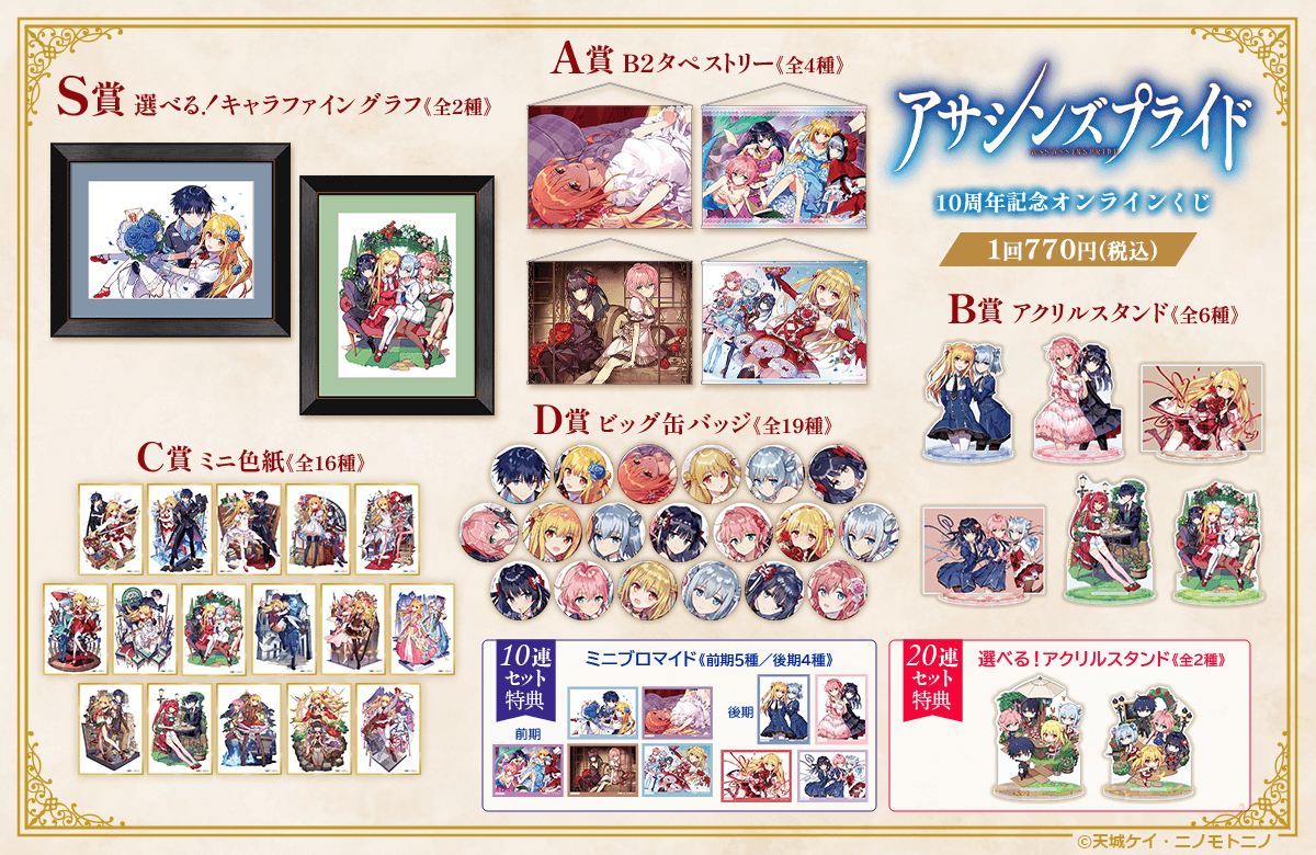 株式会社KADOKAWA(本社:東京都千代田区、取締役 代表執行役社長 CEO:夏野 剛、以下 KADOKAWA)は、運営するオンラインくじサービス「くじ引き堂」において、『アサシンズプライド』の豪華賞品が手に入る<『アサシンズプライド』10周年記念オンラインくじ>を、2026年4月28日(火)12時より販売します。