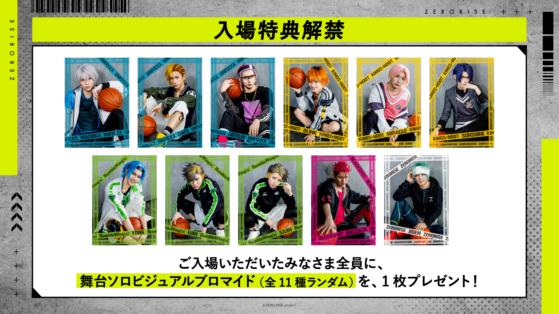 舞台『ZERO RISE』にご入場いただいたみなさま全員に、舞台ソロビジュアルブロマイド(全11種ランダム)を、1枚プレゼントいたします。