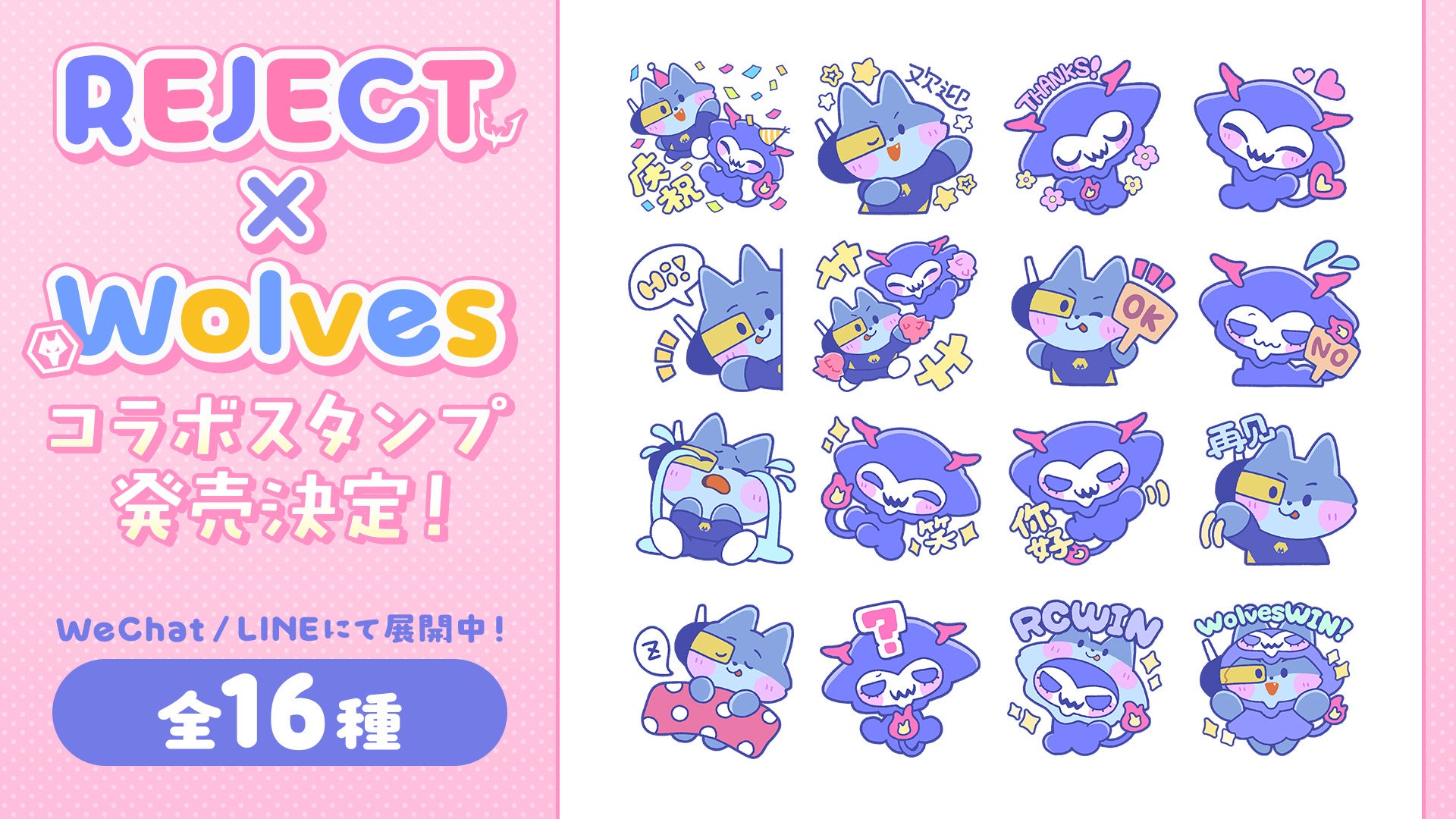 株式会社REJECT(本社:東京都港区、代表取締役:甲山翔也)が運営するeスポーツチーム「REJECT」は、中国を拠点とするeスポーツクラブ Wolves Esports とのコラボアクティベーションの一環として、両チームのマスコットキャラクターを起用したコラボスタンプを、2026年4月21日(火)よりLINEおよびWeChatにてグローバル配信することをお知らせいたします。