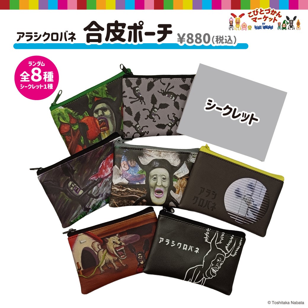 リップやピルケースなど用途いろいろな合皮ポーチです。どの柄もアラシクロバネの個性感じる場面となっています。シークレット入り!