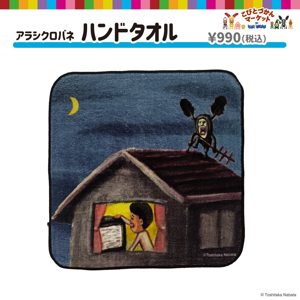 アラシクロバネの日常が描かれた持ち運びにも便利なサイズのハンドタオルです。