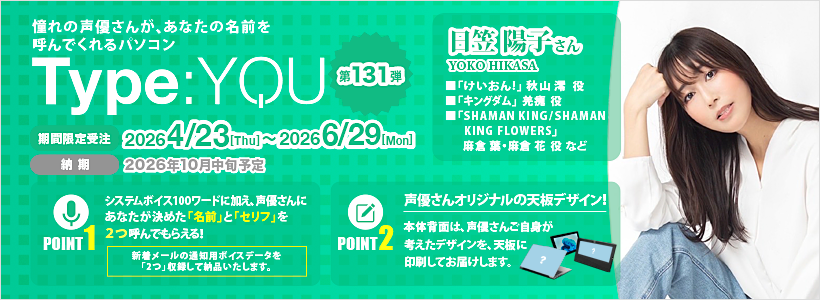 株式会社スマッシュコア エンターテインメント(本社:東京都中央区、代表取締役:福池 功)は、自社が運営する『オンリーワンPCストア【スマッシュコア】』にて、2026年4月23日(木)より、声優オリジナルパソコン【Type:YOU(タイプユー)】シリーズ第131弾となる 日笠陽子 さんモデルの受注受付を開始いたします。受注期間は2026年6月29日(月)までの期間限定となります。
