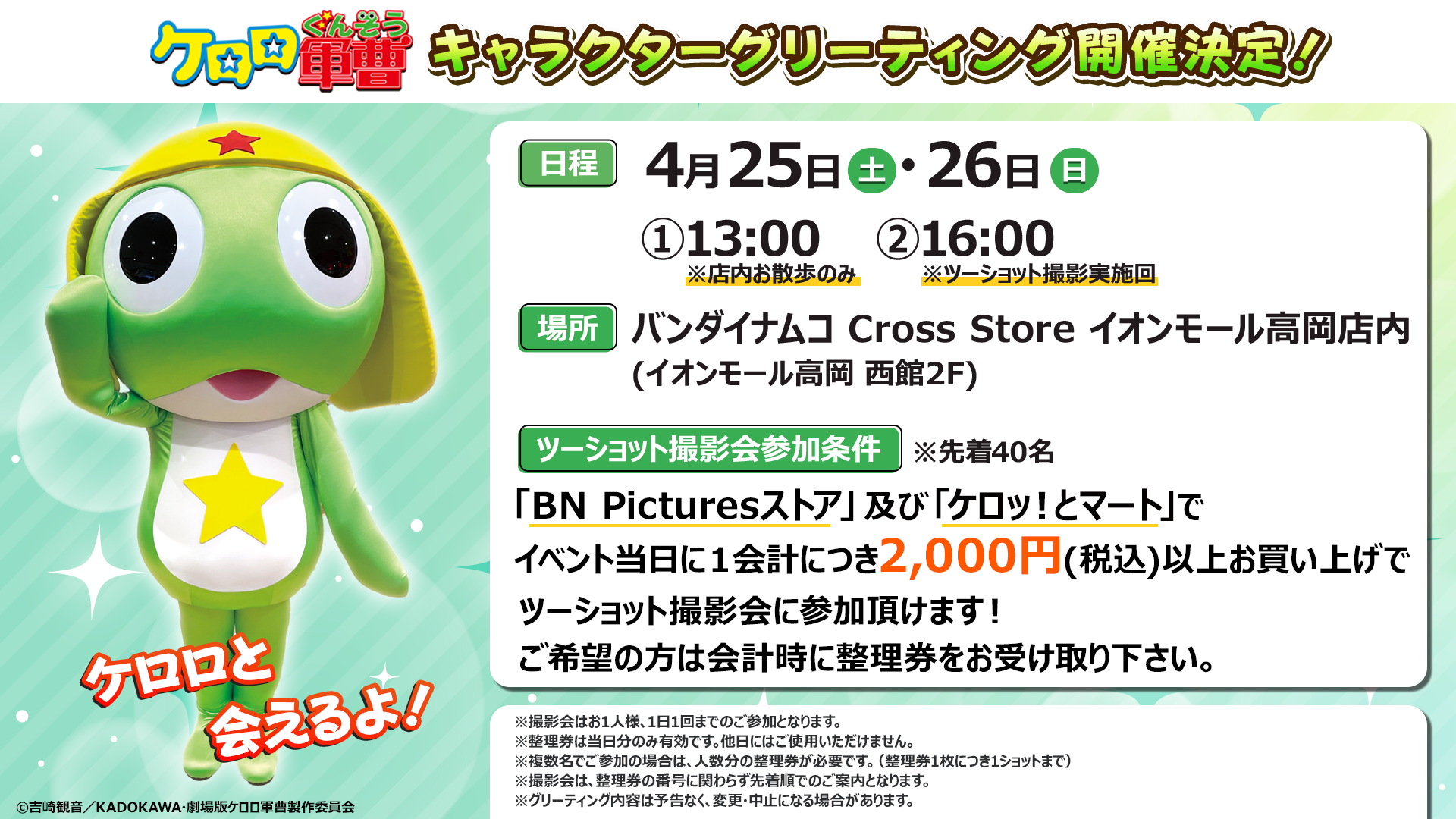 「バンダイナムコ Cross Store イオンモール高岡店」オープンを記念して、4月25日(土)・4月26日(日)の2日間、ケロロが同店舗内に登場します。
