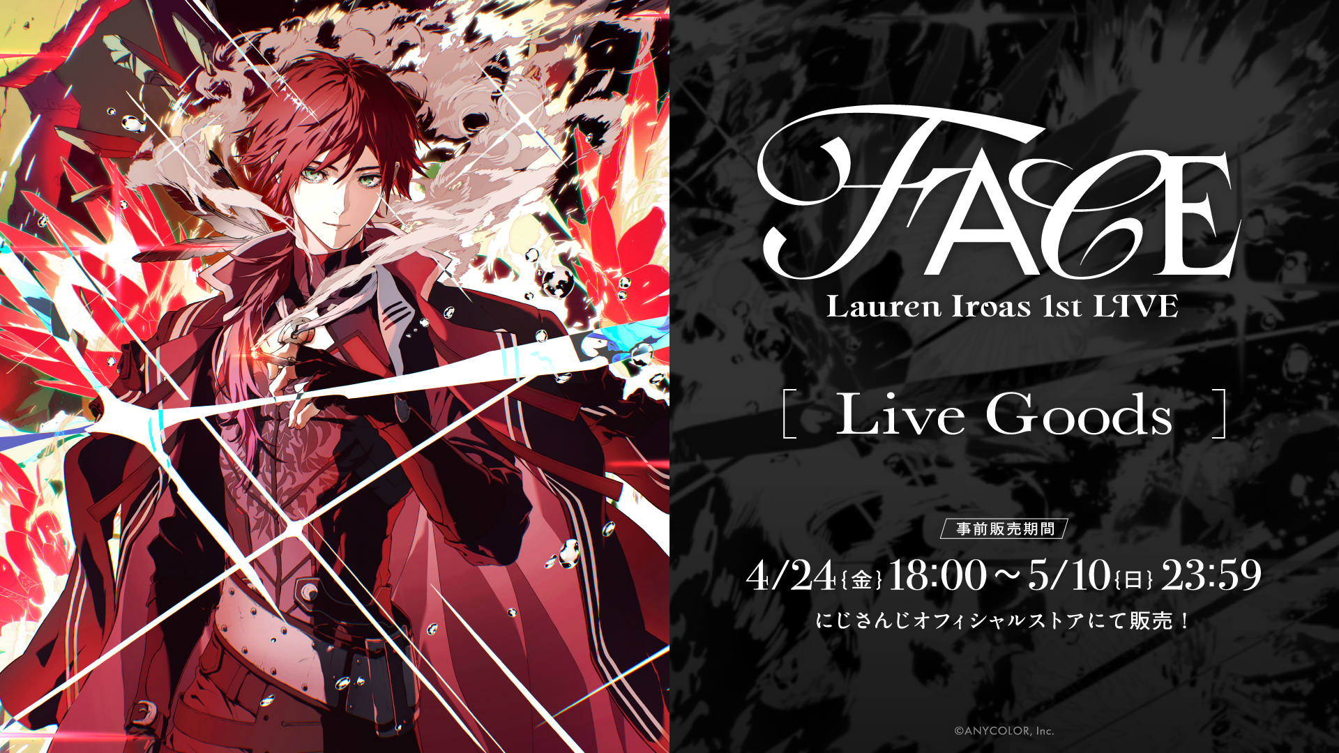 「ローレン・イロアス 1st LIVE “FACE”」グッズは、2026年4月24日(金)18時から2026年5月10日(日)23時59分の期間、にじさんじオフィシャルストア(https://shop.nijisanji.jp/)にて事前販売をいたします。